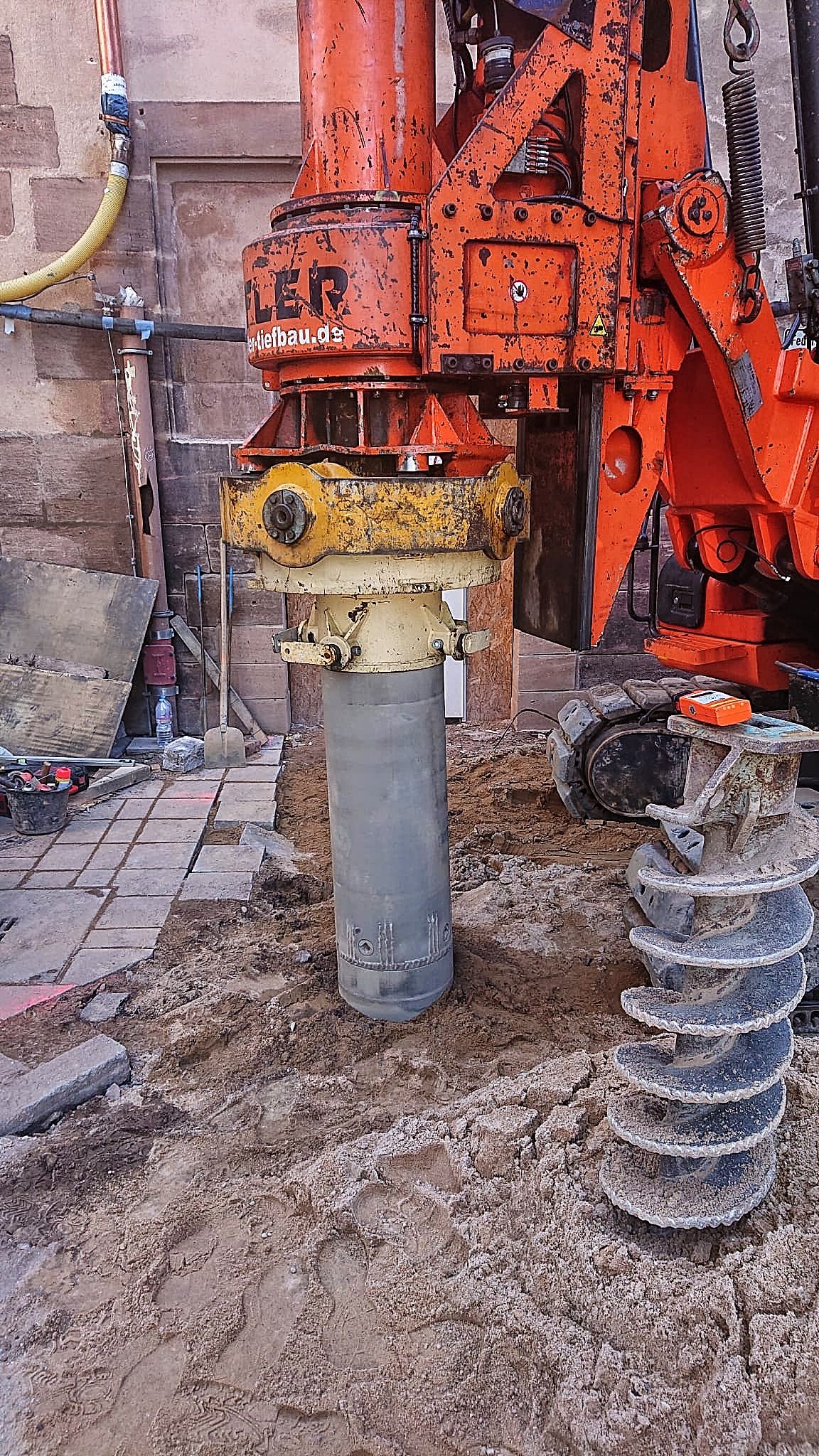 Das Bild zeigt die Baumaschine mit dem Bohraufsatz, rechts im Bild der Bohrkopf.