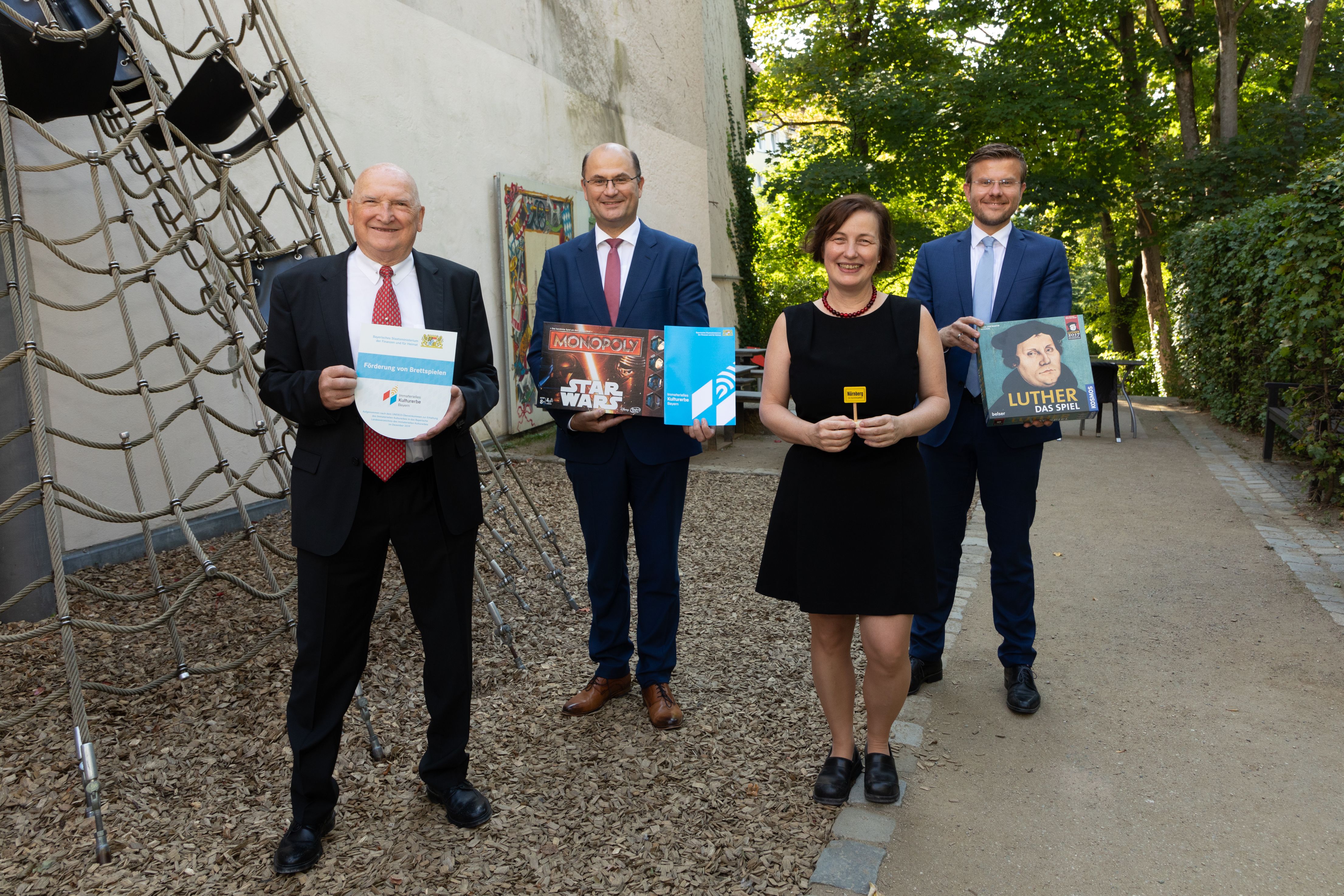 Bild 2: Verleihung der UNESCO-Urkunde "Förderung des Brettspiels" an das Spielzeugmuseum Nürnberg am 23. September 2021, von rechts: Oberbürgermeister Marcus König, Karin Falkenberg, Leiterin des Spielzeugmuseums, Albert Füracker, bayerischer Finanz- und Heimatminister, und Tom Werneck, Leiter des Spiele-Archivs München-Haar.