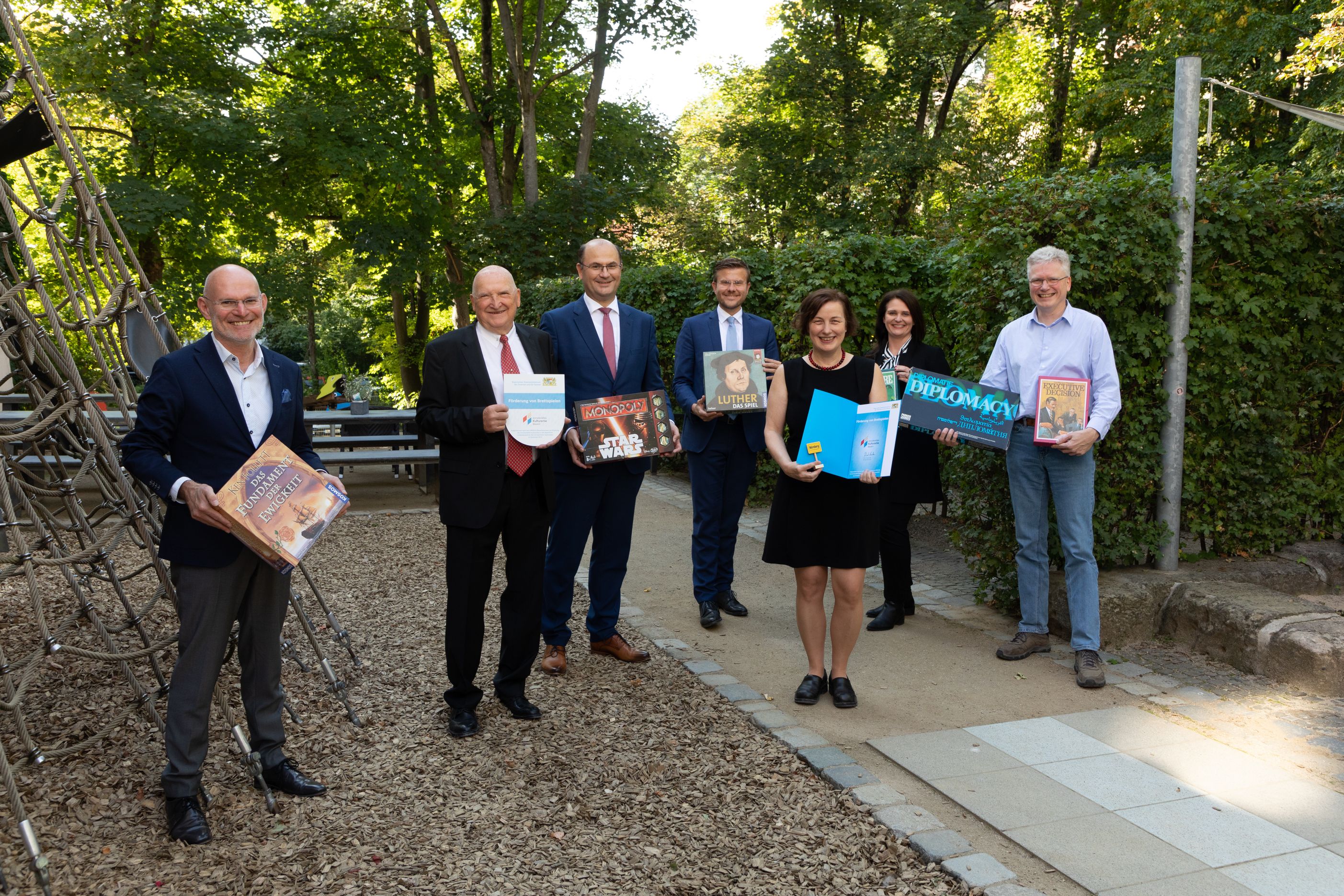 Bild 1: Verleihung der UNESCO-Urkunde "Förderung des Brettspiels" an das Spielzeugmuseum Nürnberg am 23. September 2021, von links: Thomas Eser, Direktor der Museen und stellvertretend für das Deutsche Spielearchiv Nürnberg, Tom Werneck, Leiter des Bayerischen Spielearchivs München-Haar, Albert Füracker, bayerischer Finanz- und Heimatminister, Oberbürgermeister Marcus König, Karin Falkenberg, Leiterin des Spielzeugmuseums, Scarlett Wisotzki, Spielwarenmesse, und Jens Junge, Institut für Ludologie, Berlin-Nürnberg.