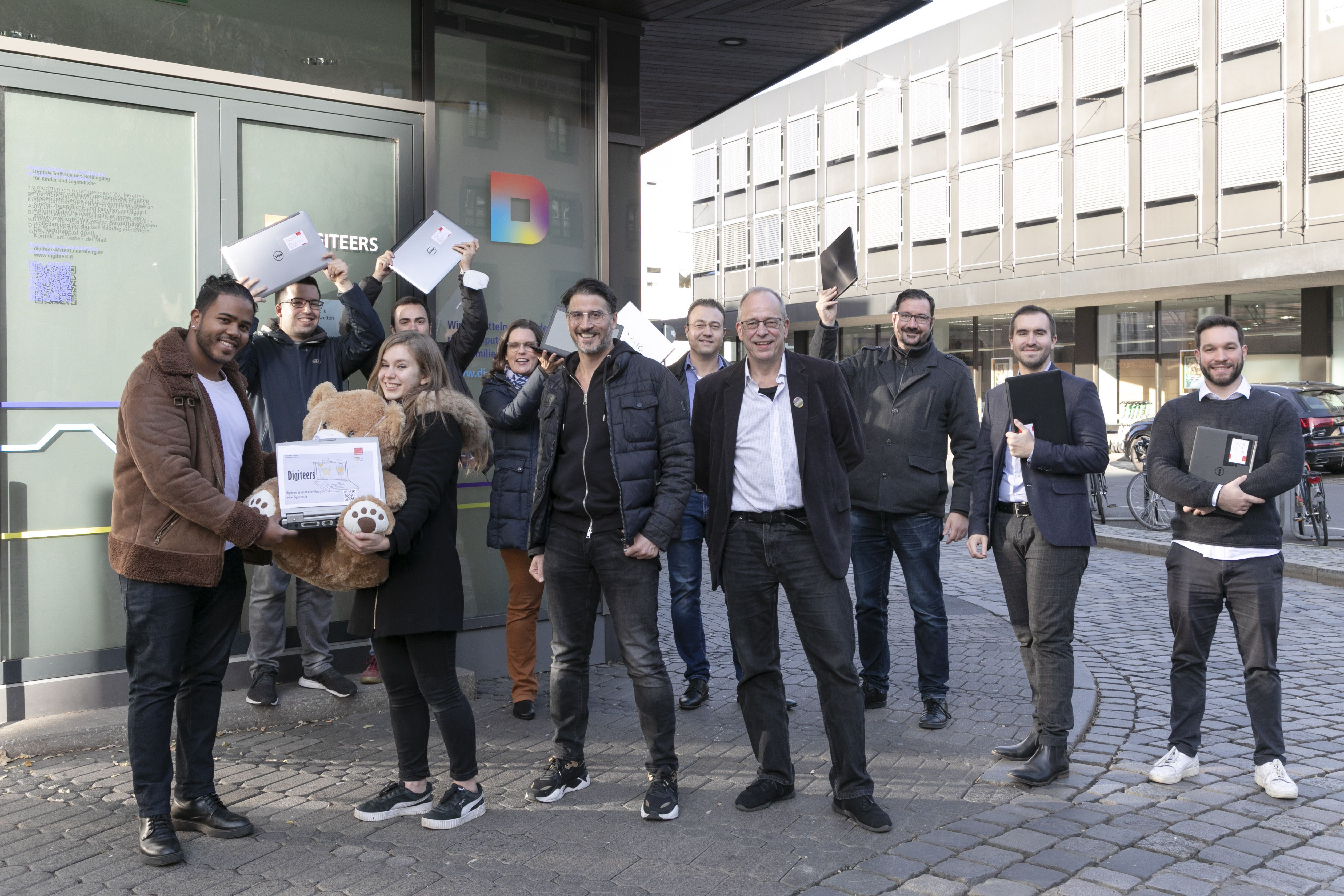 Vor der neugestalteten "Digiteers"-Werkstatt (von links nach rechts in der ersten Reihe): Giullaume Giroufle (inopia foundation), Ruth Kupermann (Projektkoordinatorin, mit Projekt-Maskottchen "Digi-Tier"), Tomas di Stasio (Rotary Club Nürnberg-Connect) und Uli Glaser (Sozialreferat Stadt Nürnberg) mit Ehrenamtlichen und Helfern.