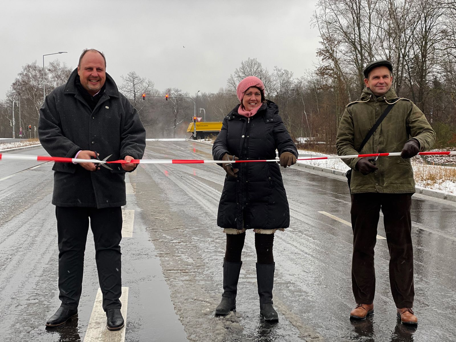 Bürgermeister Christian Vogel, Esther Gilcher, Projektverantwortliche für Lichtenreuth bei der Aurelius Real Estate, und Pierre Schwarz, Aurelis-Projektmanager, geben die neue Straße zum Stadtviertel Lichtenreuth frei (v.l.n.r.).