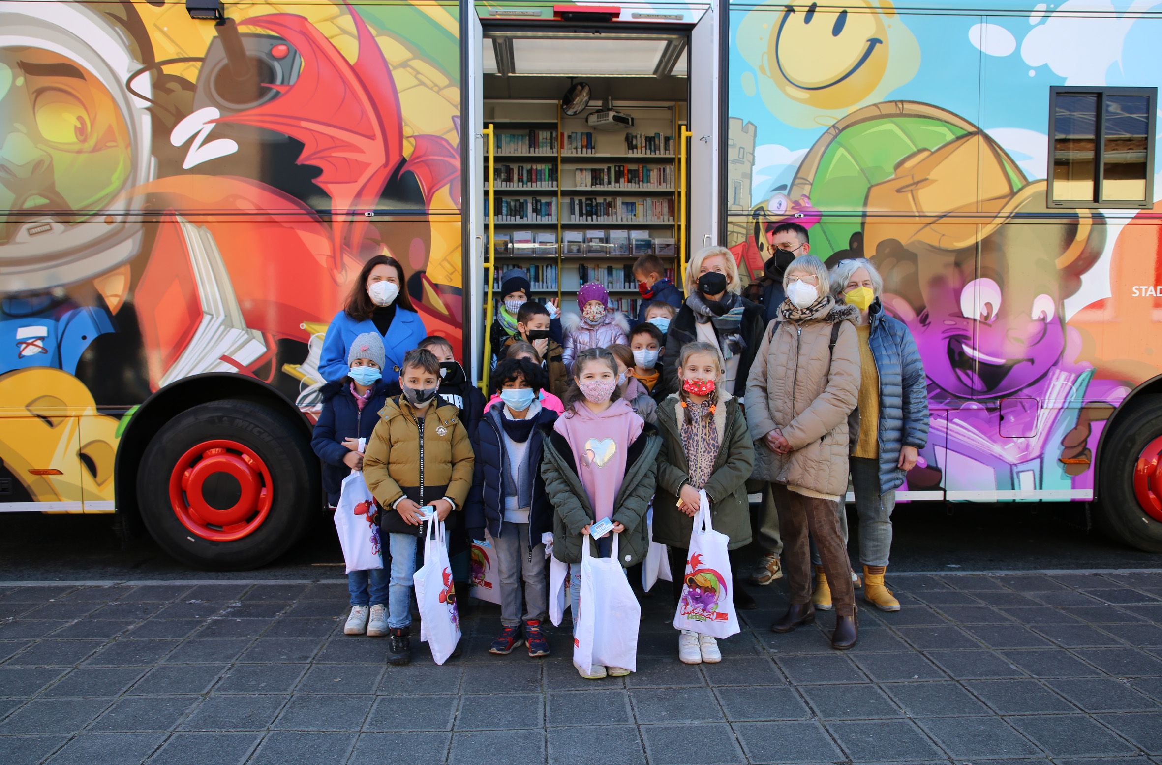 Am neuen Bücherbus vor der Friedrich-Wanderer-Schule (hinten v.li.n.re.): die Referentin für Schule und Sport, Cornelia Trinkl, Bürgermeisterin Prof. Dr. Julia Lehner, die Direktorin der Stadtbibliothek, Elisabeth Sträter, sowie dahinter der Streetart-Künstler und Gestalter des Busses, Hombre SUK, und Monika Schunigl, Leiterin der Fahrbibliothek, mit Schülerinnen und Schülern der Klasse 2d der Friedrich-Wanderer-Schule.