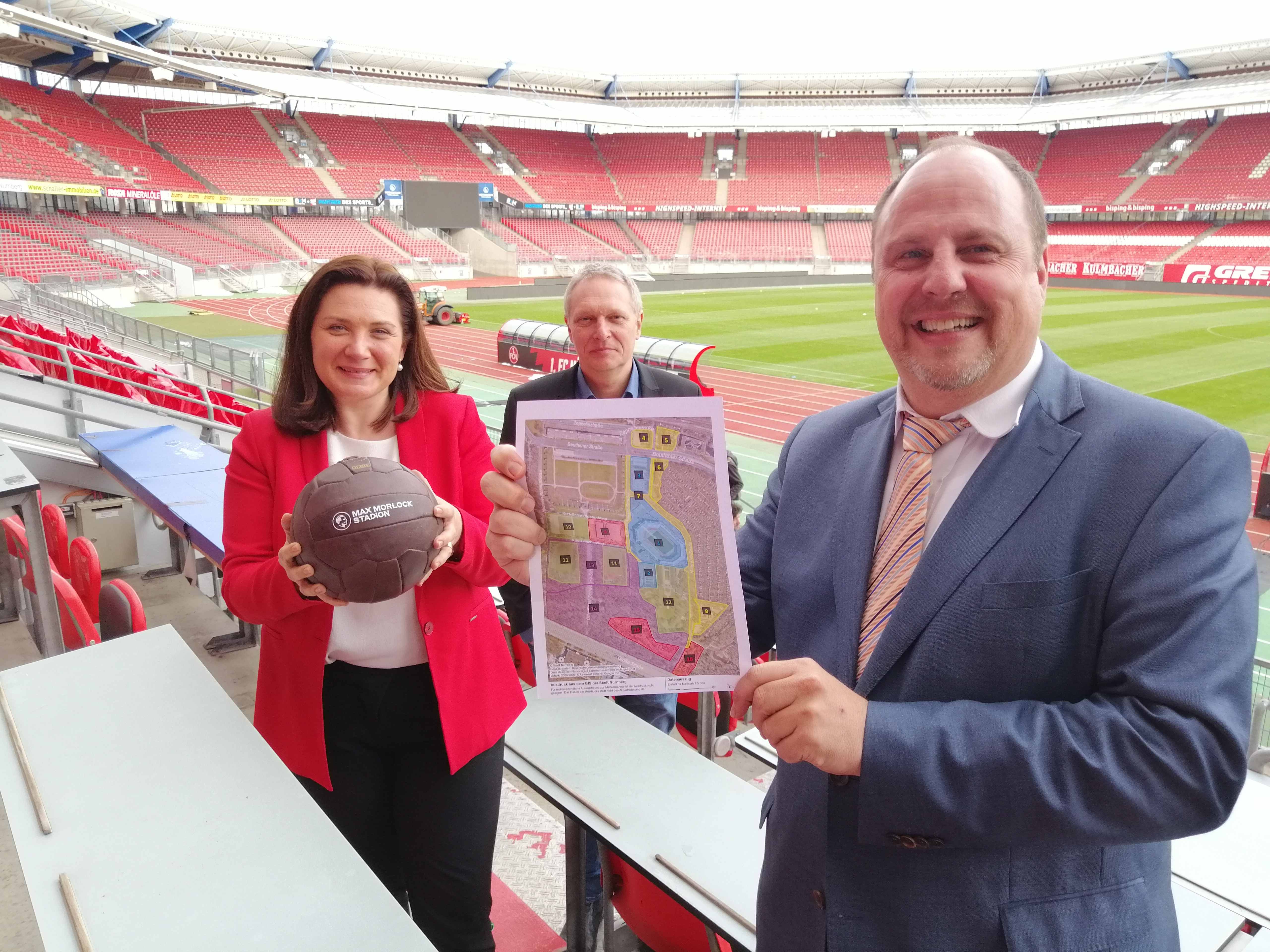 Stellen das weitere Vorgehen zur Stadionentwicklung in Nürnberg vor (v.l.n.r): Cornelia Trinkl, Referentin für Schule und Sport, Detlef Stenger, Zweiter Werkleiter des städtischen Eigenbetriebs Frankenstadion Nürnberg (FSN), und Bürgermeister Christian Vogel, Erster Werkleiter des FSN.