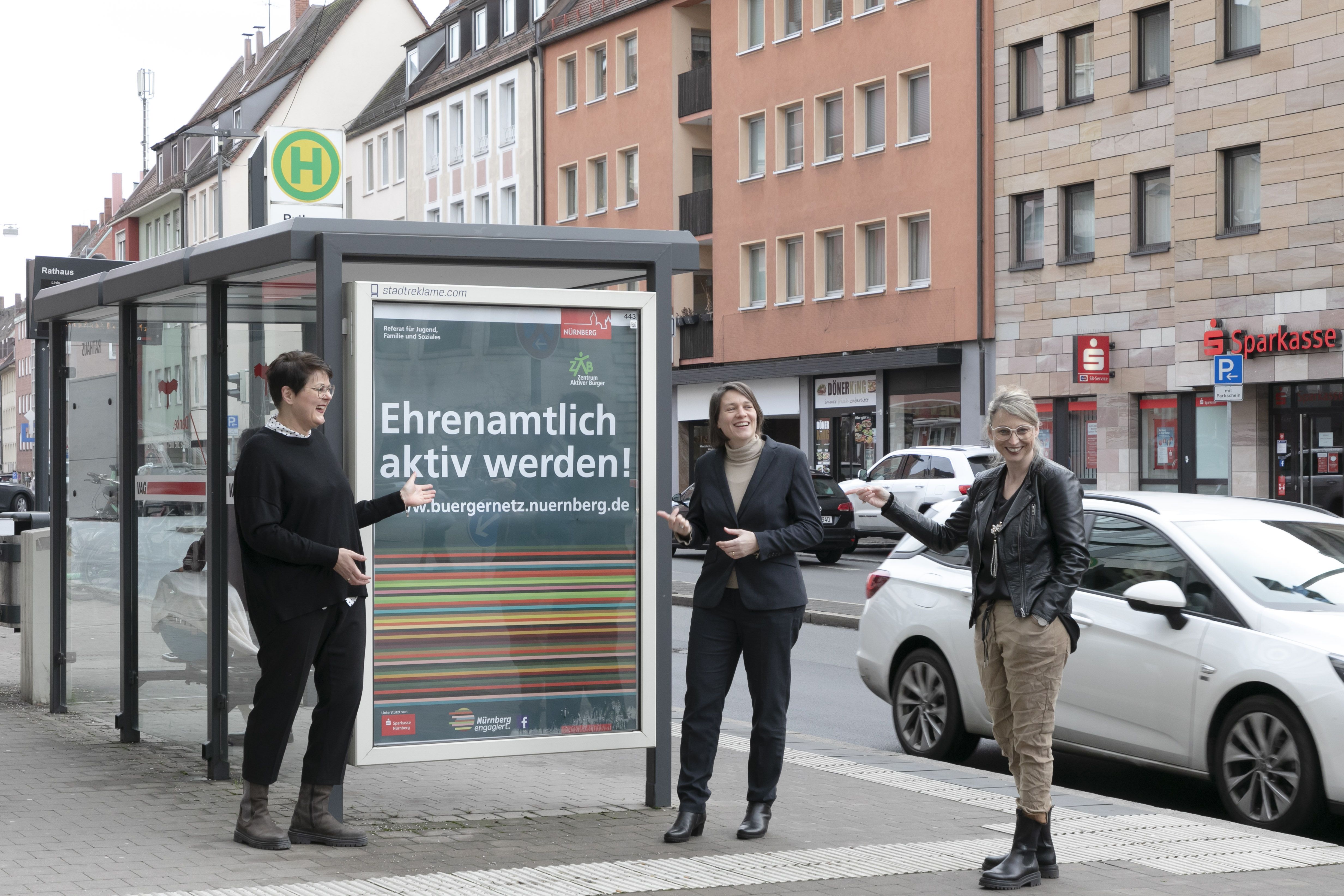 Beate Treffkorn, Leiterin Unternehmenskommunikation der Sparkasse Nürnberg, Elisabeth Ries, Referentin für Jugend, Familie und Soziales der Stadt Nürnberg, und Katja Strohhacker, Geschäftsführerin der Stadtreklame Nürnberg, (von links) vor einem der Engagement-Plakate.