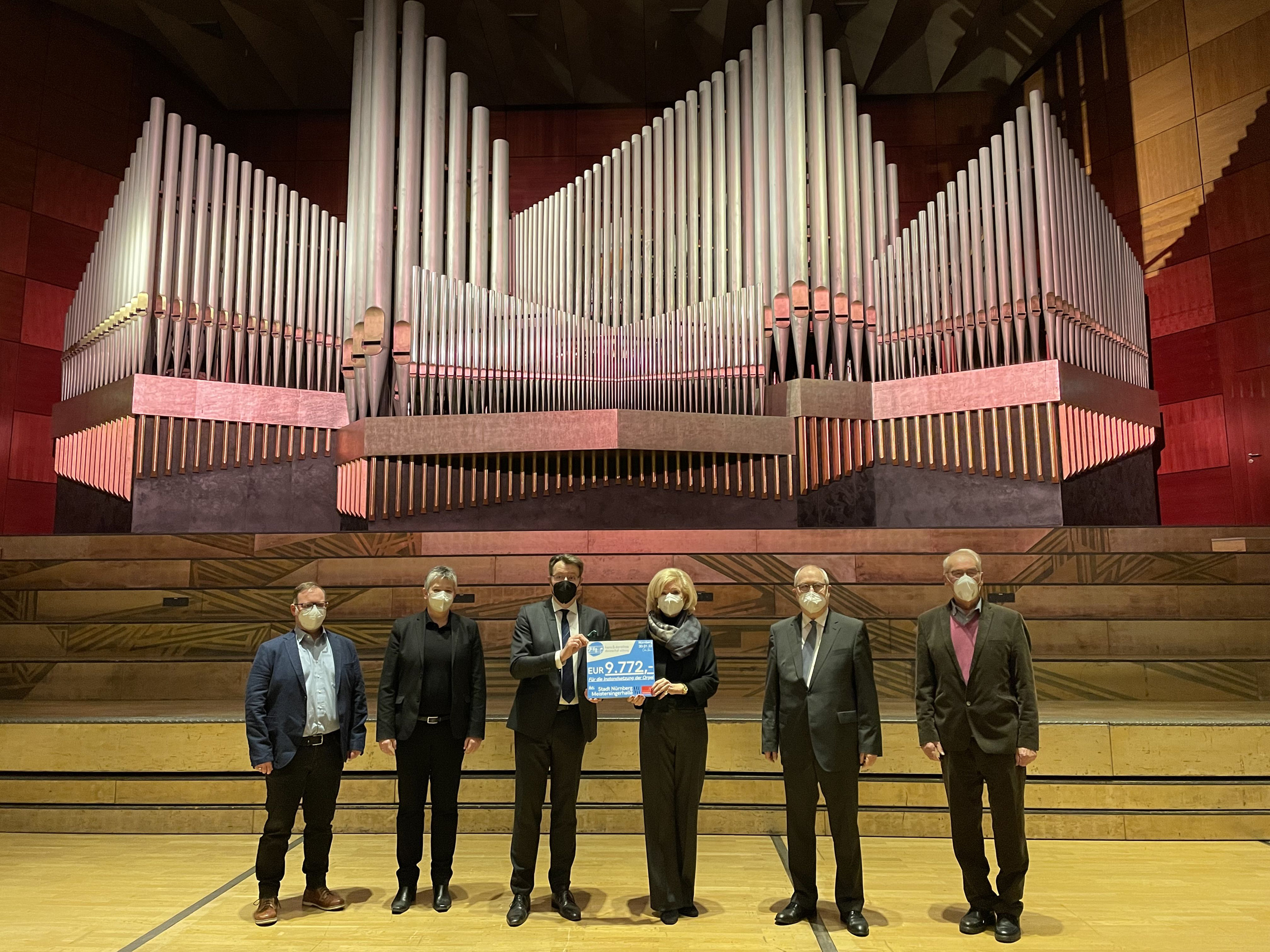 Spendenübergabe vor der Steinmeyer-Orgel im Großen Saal der Meistersingerhalle. Im Bild (von li.n.re.) Dr. Christian Büttner (Kustos der Orgel Meistersingerhalle), Katharina Puff-Schwartz (Geschäftsleitung Meistersingerhalle), Prof. Dr. Julia Lehner (2. Bürgermeisterin Stadt Nürnberg), Michael Frieser (Stiftungsratsvorsitzender Doleschal Stiftung), Michael Langer (stellvertretender Stiftungsratsvorsitzender Doleschal Stiftung), Ulrich Mayer (Stiftungsvorstand Doleschal Stiftung)