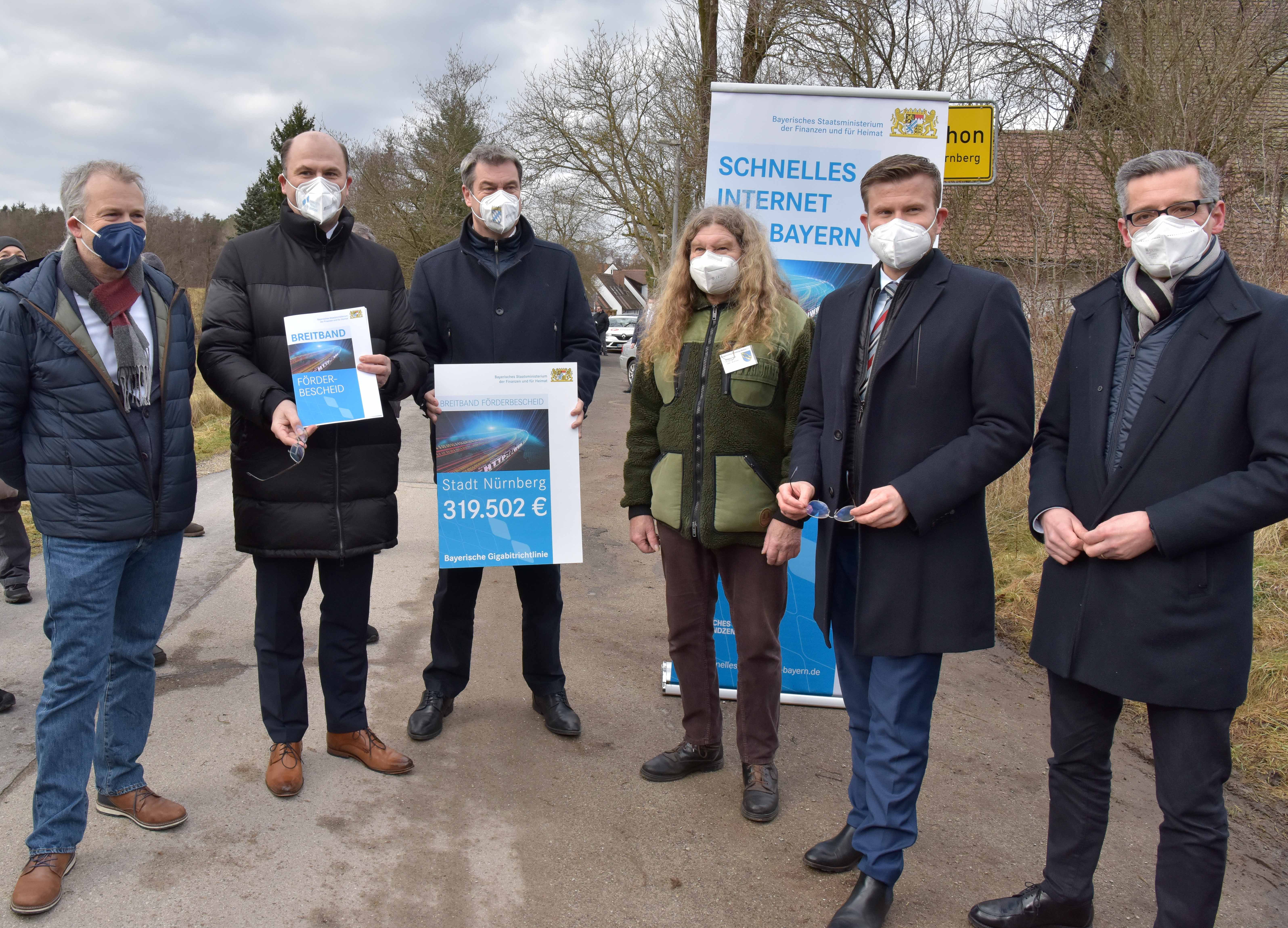 Von links: Bisping & Bisping-Geschäftsführer Johannes Bisping, Finanz- und Heimatminister Albert Füracker, Ministerpräsident Dr. Markus Söder, der Stadtteilsprecher Birnthon des Bürgervereins Nürnberg-Südost, Wolfgang Kautz, Oberbürgermeister Marcus König und Wirtschafts- und Wissenschaftsreferent Dr. Michael Fraas bei der Übergabe des Breitband-Förderbescheids in Nürnberg-Birnthon.