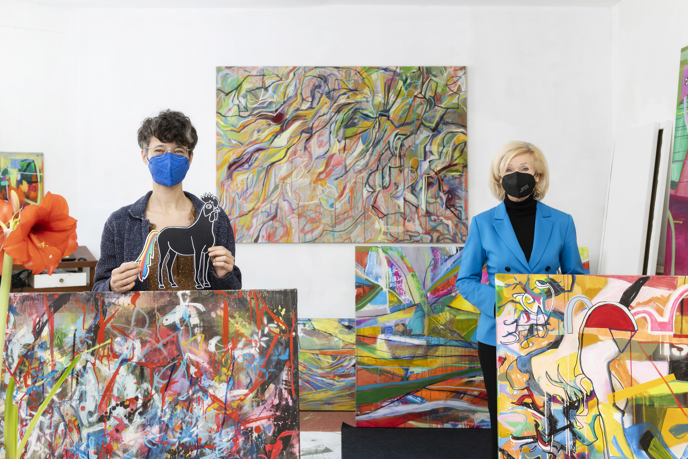 Die Burgkünstlerin 2022 Sascha Banck (links) und Kulturbürgermeisterin Prof. Dr. Julia Lehner (rechts) stellen die Burgprojektion 2022 „Streifzug durchs Paralleluniversum“ in Bancks Atelier in Fürth vor