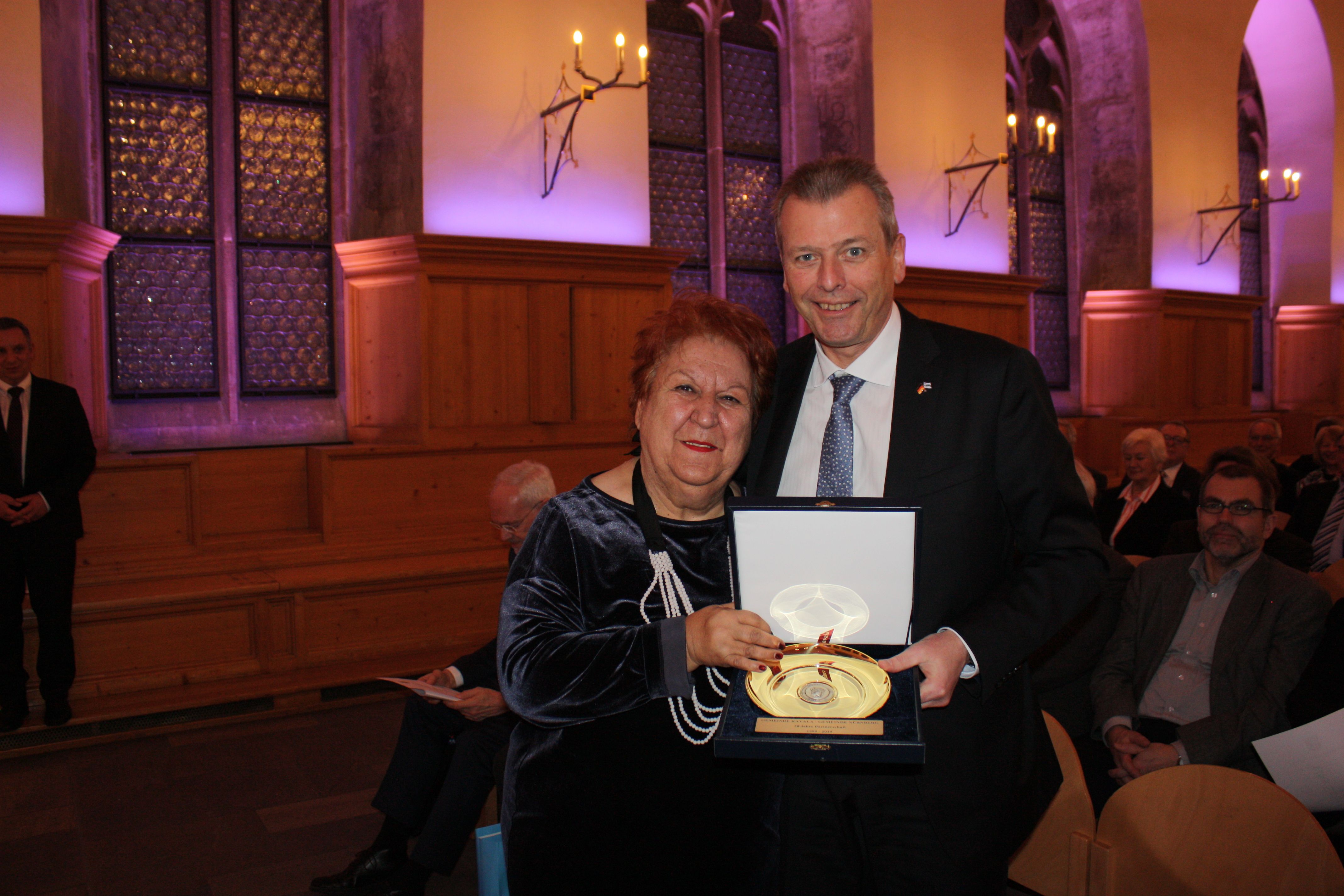 Festakt zu 20 Jahren Städtepartnerschaft Nürnberg-Kavala im Historischen Rathaussaal Nürnberg im Jahr 2019, mit den damaligen Stadtoberhäuptern, Bürgermeisterin Dimitra Sanaka und Oberbürgermeister Ulrich Maly.