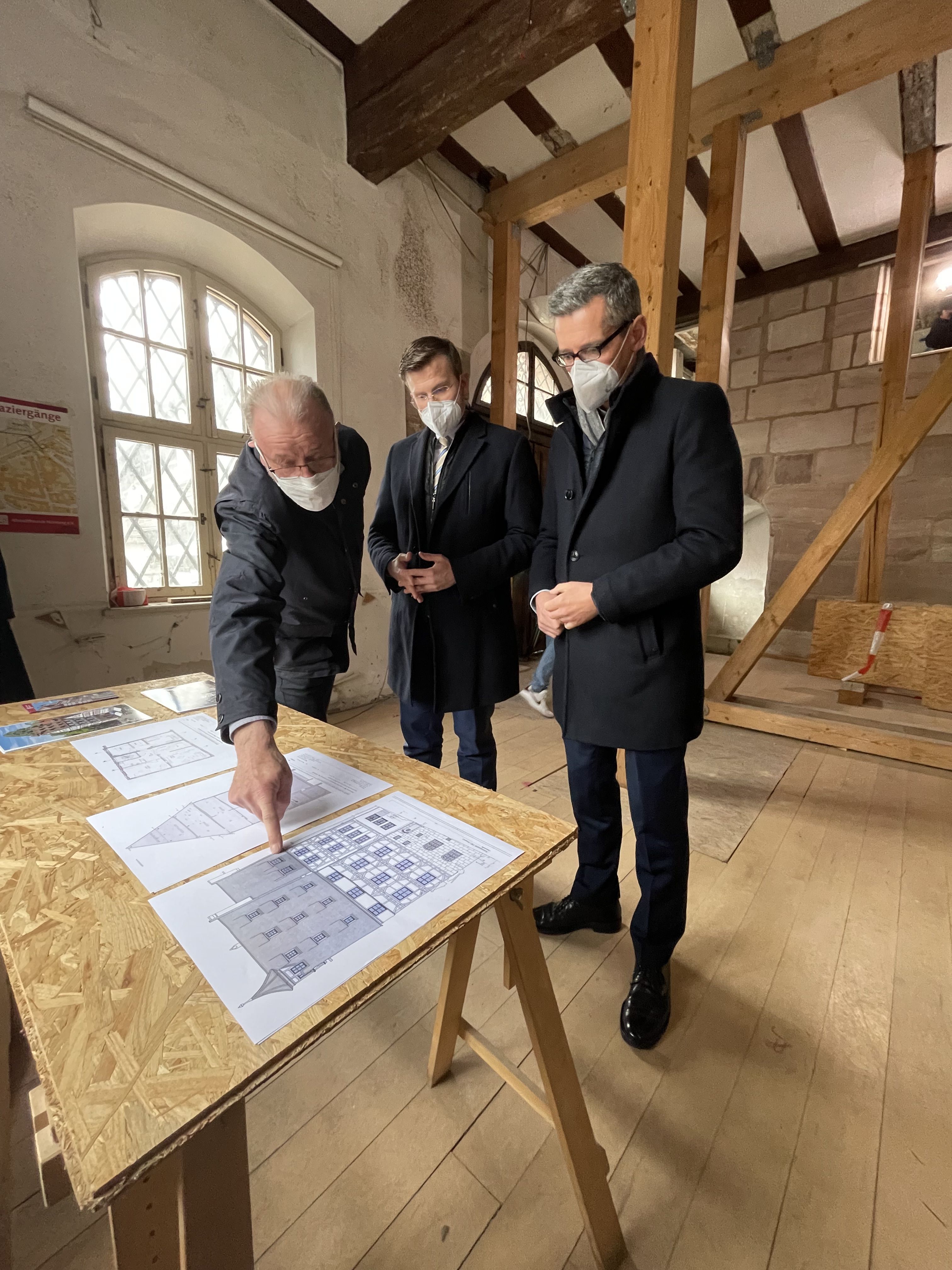 Der Verein Altstadtfreunde Nürnberg e.V. saniert das Pilatushaus. Die Hintergründe der Überlassung und das weitere Vorgehen haben Oberbürgermeister Marcus König, Wirtschafts- und Wissenschaftsreferent Dr. Michael Fraas (rechts) und Karl-Heinz Enderle (links), Vorsitzender der Altstadtfreunde, am Donnerstag, 17. März 2022, im Pilatushaus beim Tiergärtnertor, Obere Schmiedgasse 64 / 66, vorgestellt.