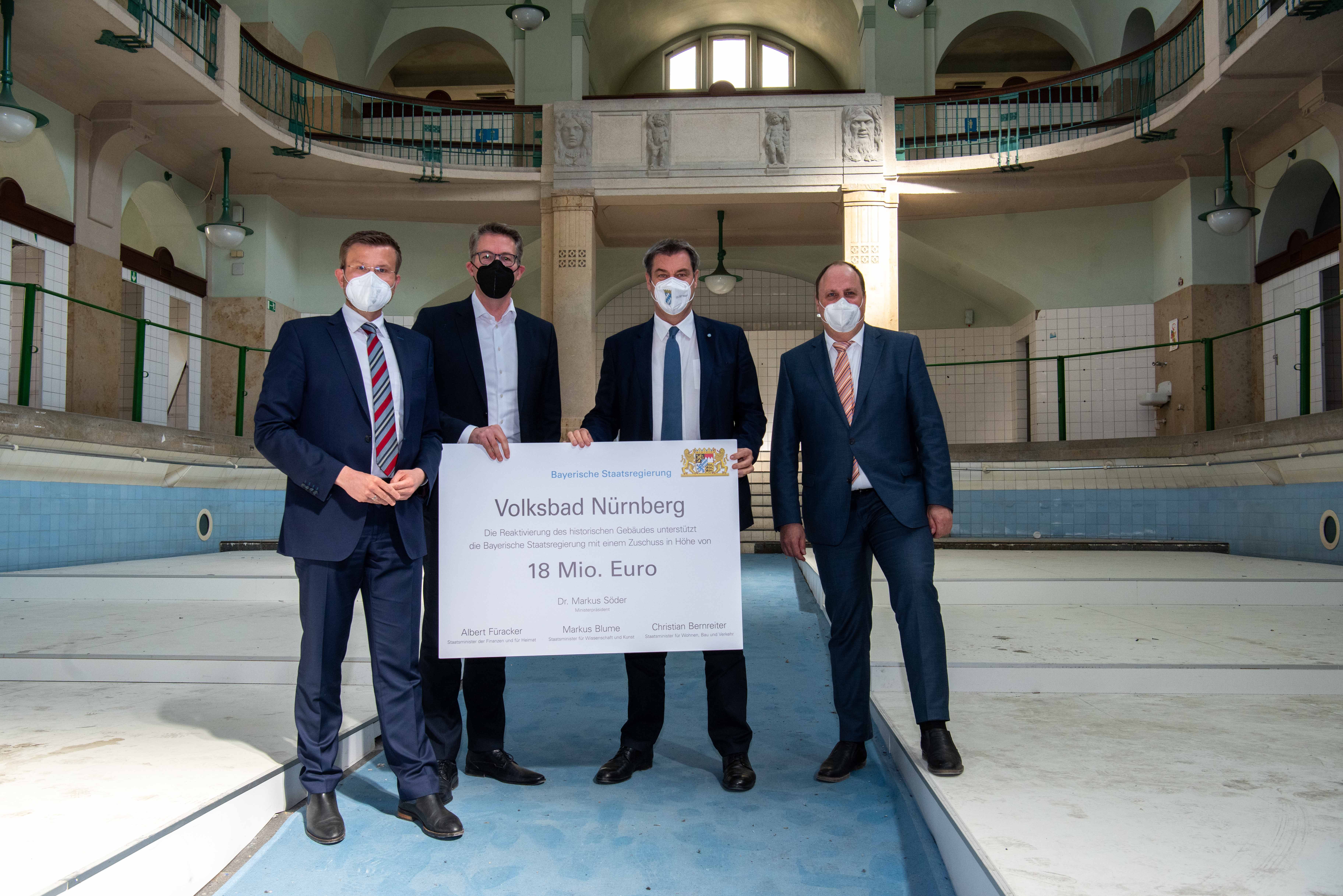 Ministerpräsident Dr. Markus Söder und der Staatsminister für Wissenschaft und Kunst, Markus Blume, haben am heutigen Donnerstag, 24. März 2022, die Förderzusage des Freistaats Bayern in Höhe von 18 Millionen Euro zur Sanierung des Volksbads an Nürnbergs Oberbürgermeister Marcus König und Bürgermeister und Ersten Werkleiter von NürnbergBad, Christian Vogel, übergeben.