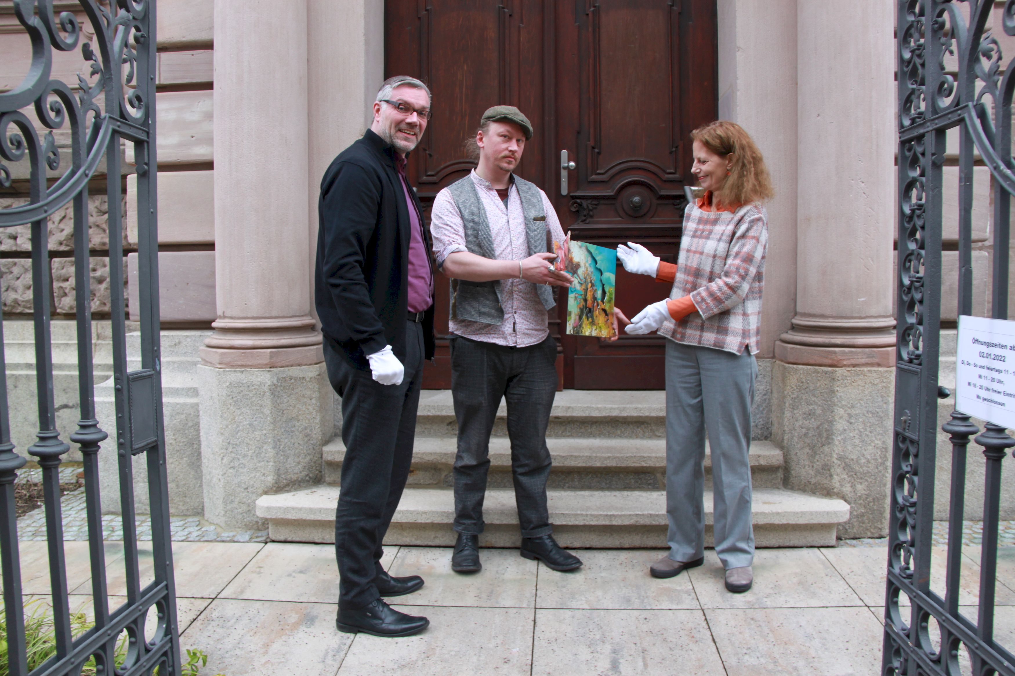 Andreas Wissen übergibt als Kunstvilliger das Werk „Der Barock gewinnt“ von Kai Klahre (Mitte) an die Leiterin der Kunstvilla Andrea Dippel.