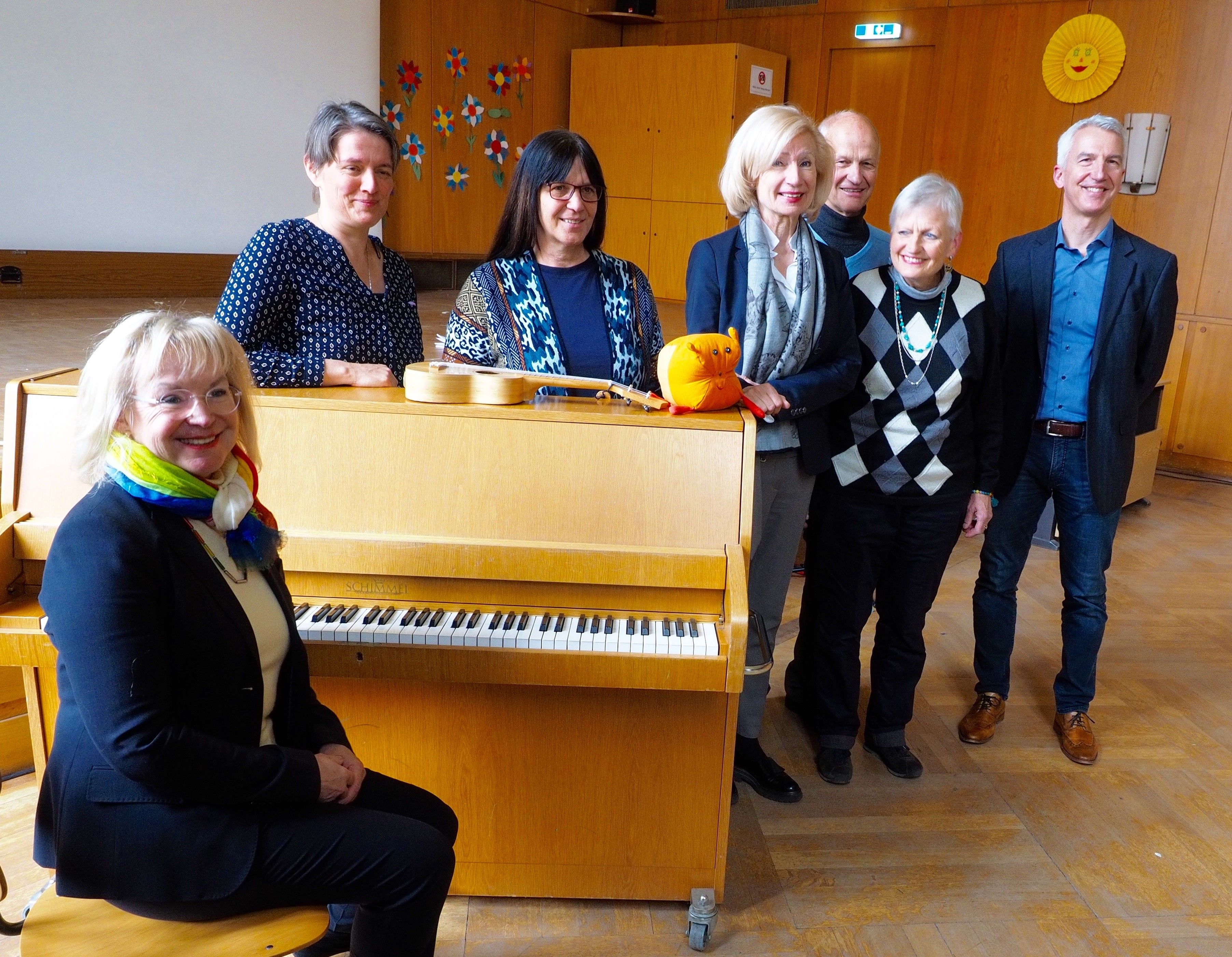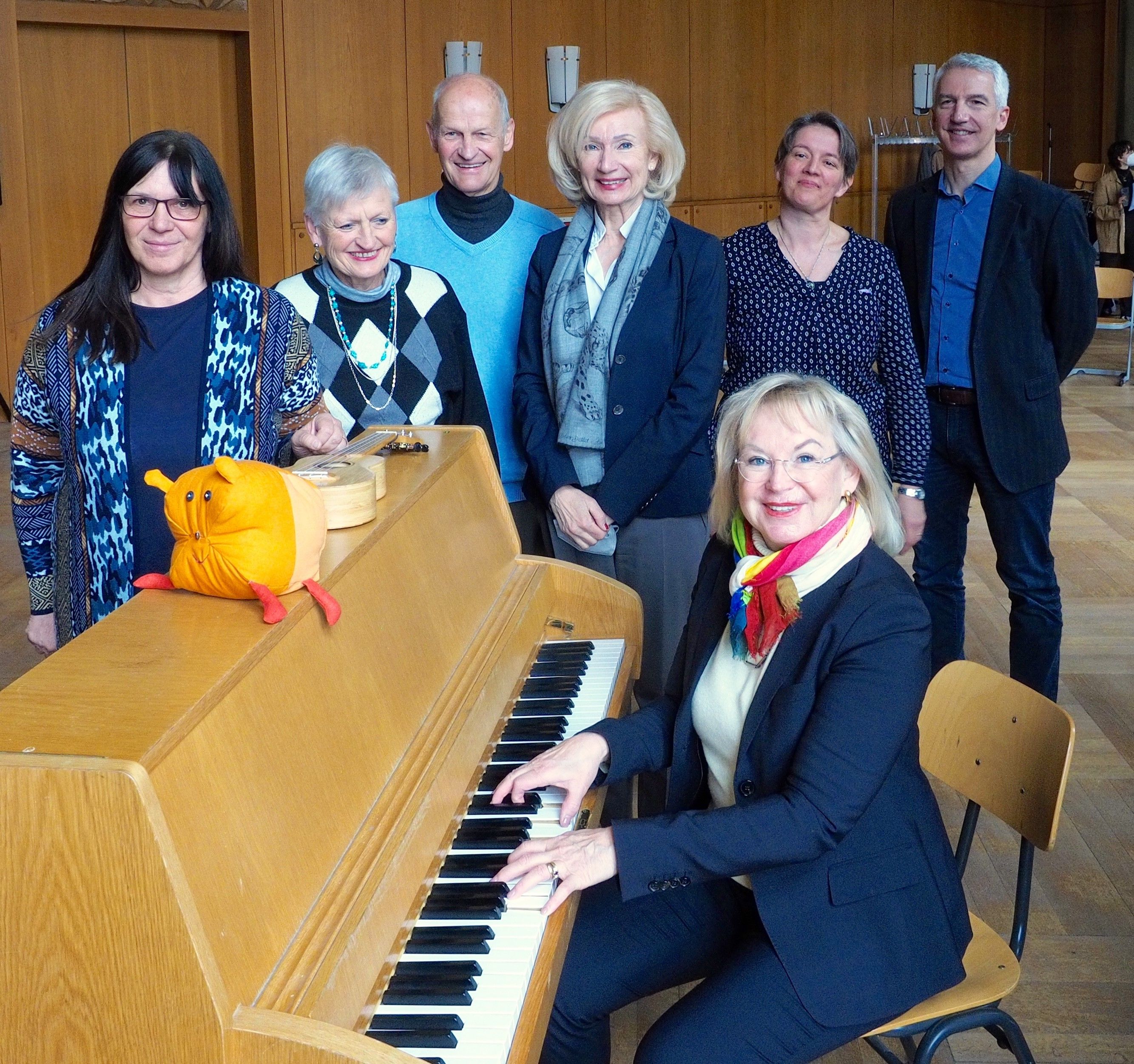 Foto 2, von links nach rechts: Gabriele Rüll, Musikschulleitung, Projektleitung „Das Klangvielfraß“ Amt für Kultur und Freizeit der Stadt Nürnberg (KUF), Gerlinde und Helmut Gierse, Stiftung Persönlichkeit, Prof. Dr. Julia Lehner, Kulturbürgermeisterin der Stadt Nürnberg, Marie-Laure Dubreil-Steinkrug, Musikpädagogin an der Musikschule Nürnberg im KUF, Markus Schmeiser, Schulleitung Knauerschule, und am Klavier: Barbara Regitz, Mitglied des Landtags.