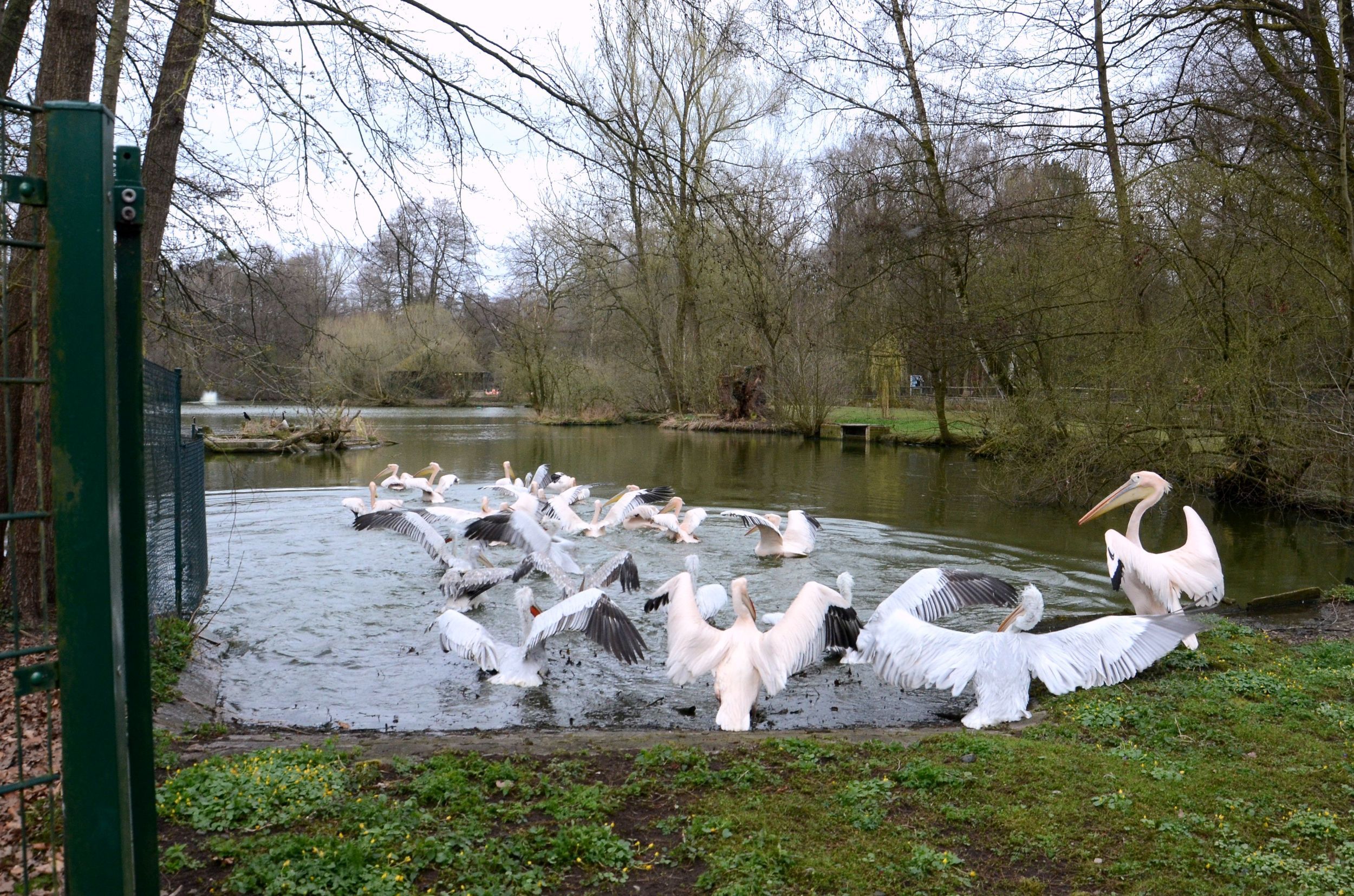 Bild Download: Die Pelikane haben ihr Winterquartier auf Gut Mittelbüg geräumt. Zurück im Tiergarten zieht es sie sofort ins Wasser der Weiheranlage.