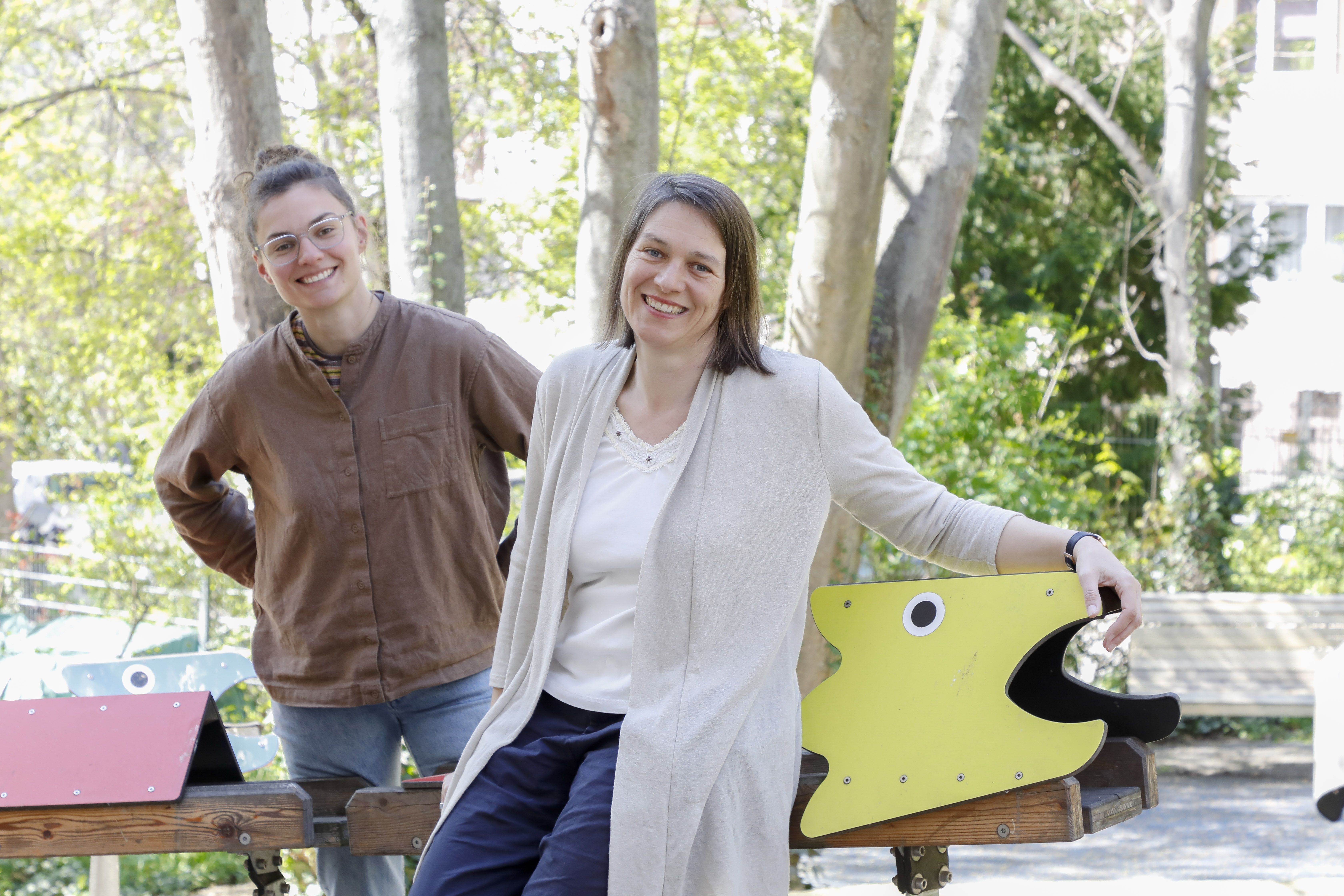Lena Endres, Bluepingu e.V. und geschäftsführend für das neue Netzwerk Klimaschutz und Bürgerschaftliches Engagement, und Elisabeth Ries, Referentin für Jugend, Familie und Soziales, freuen sich über die Förderung.