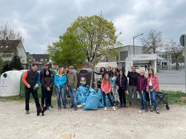 Das Bild zeigt die Teilnehmerinnen und Teilnehmer des Nürnberger Ortsteils Wetzendorf. Rund 20 Bewohnerinnen und Bewohner haben in den Osterferien 2022 in Wetzendorf mehr als zehn Säcke Müll und Unrat eingesammelt und so dazu beigetragen, das Stadtbild zu verschönern.