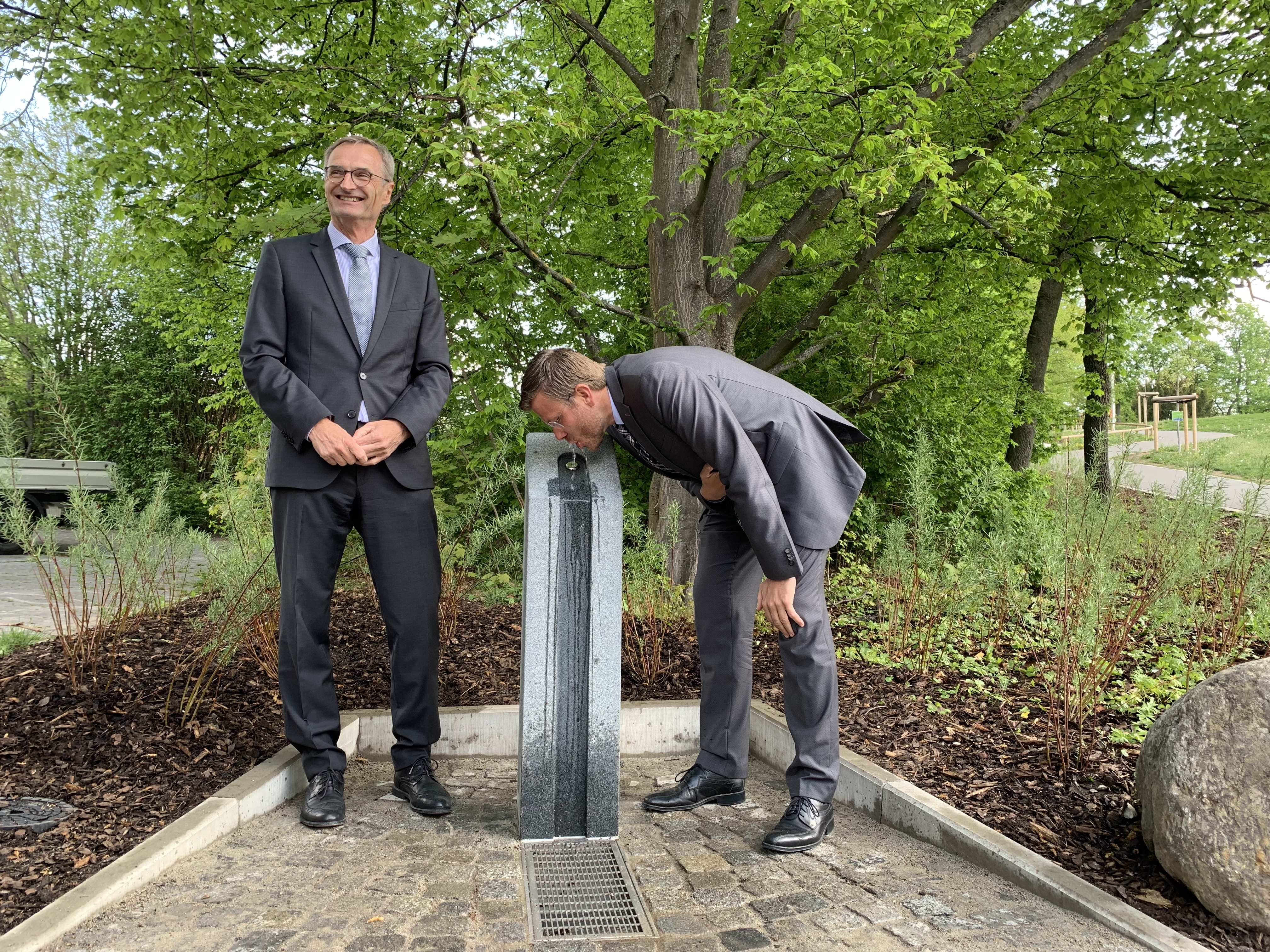 Oberbürgermeister Marcus König (rechts) und N-Ergie-Vorstandsvorsitzender Josef Hasler weihen den neuen Trinkwasserbrunnen in der Rechenberganlage ein.
