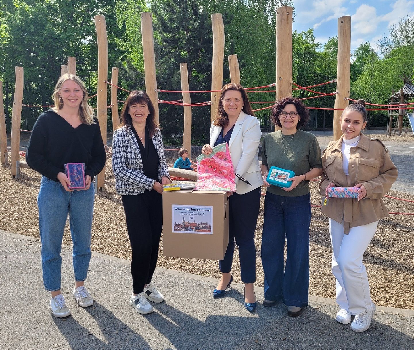 Schulreferentin Cornelia Trinkl und Vertreterinnen des Vorstands der Stadt SV e. V. übergeben ein voll bestücktes „Schüler helfen Schülern“-Paket für die geflüchteten ukrainischen Schülerinnen und Schüler an die Schulleitung Tanja Stör der Bartholomäus-Schule. Von links: Lena Perina, Vorstand Stadt SV e. V., Tanja Stör, Schulleitung Bartholomäus-Schule, Schul- und Sportreferentin Cornelia Trinkl, Rosanna Stagari, Sekretärin an der Bartholomäus-Schule, und Patrizia Plotnikow, Vorstand Stadt SV e. V.