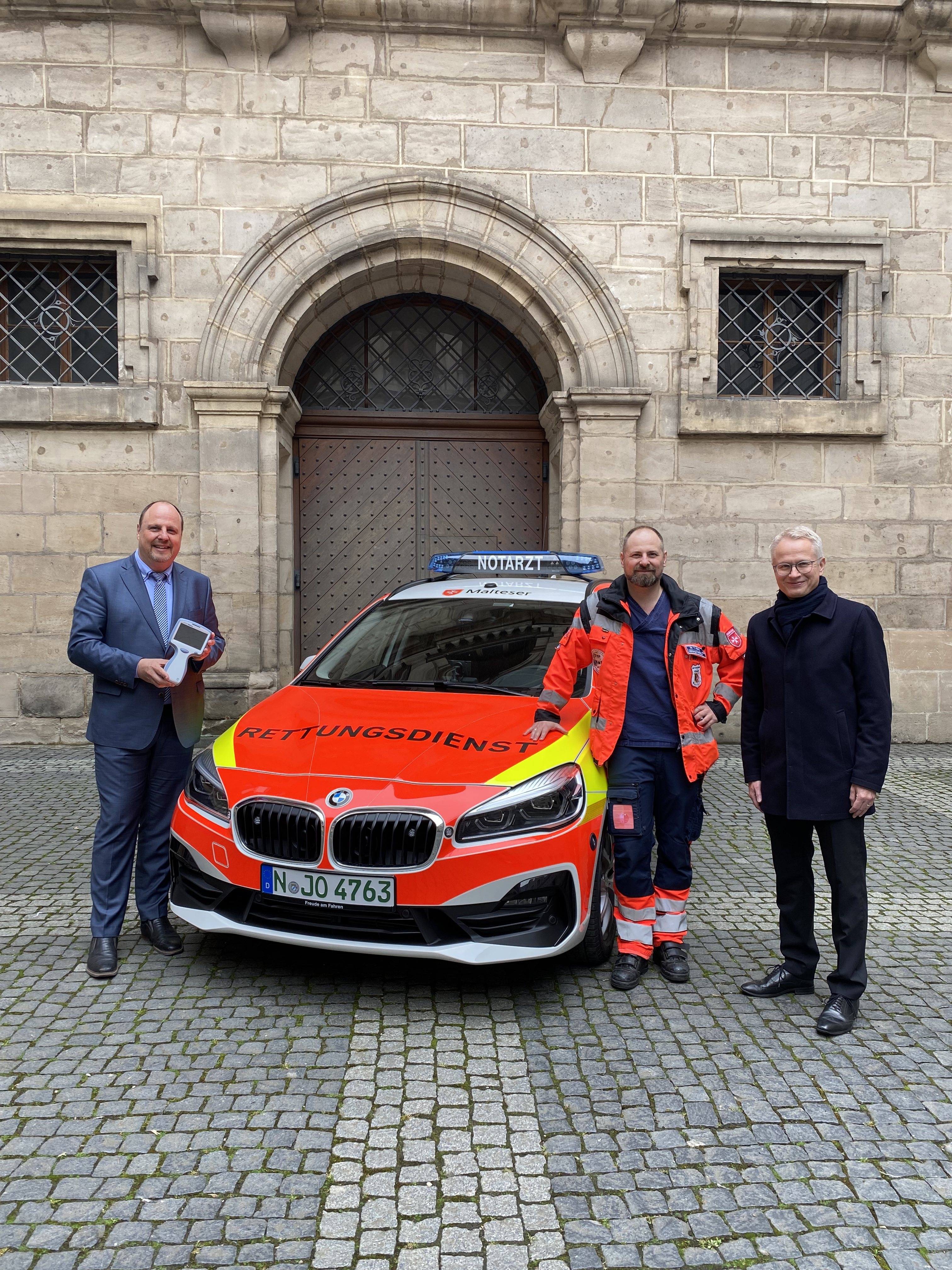 Bürgermeister Christian Vogel hat am heutigen Freitag, 6. Mai 2022, gemeinsam mit Dr. Tobias Hübner, Nürnberger Notärzte e. V., und Dr. Michael Kläver, stellvertretendes Vorstandsmitglied der Sparkasse Nürnberg, ein Blaulichtfahrzeug mit Blutgasanalysegerät vorgestellt.