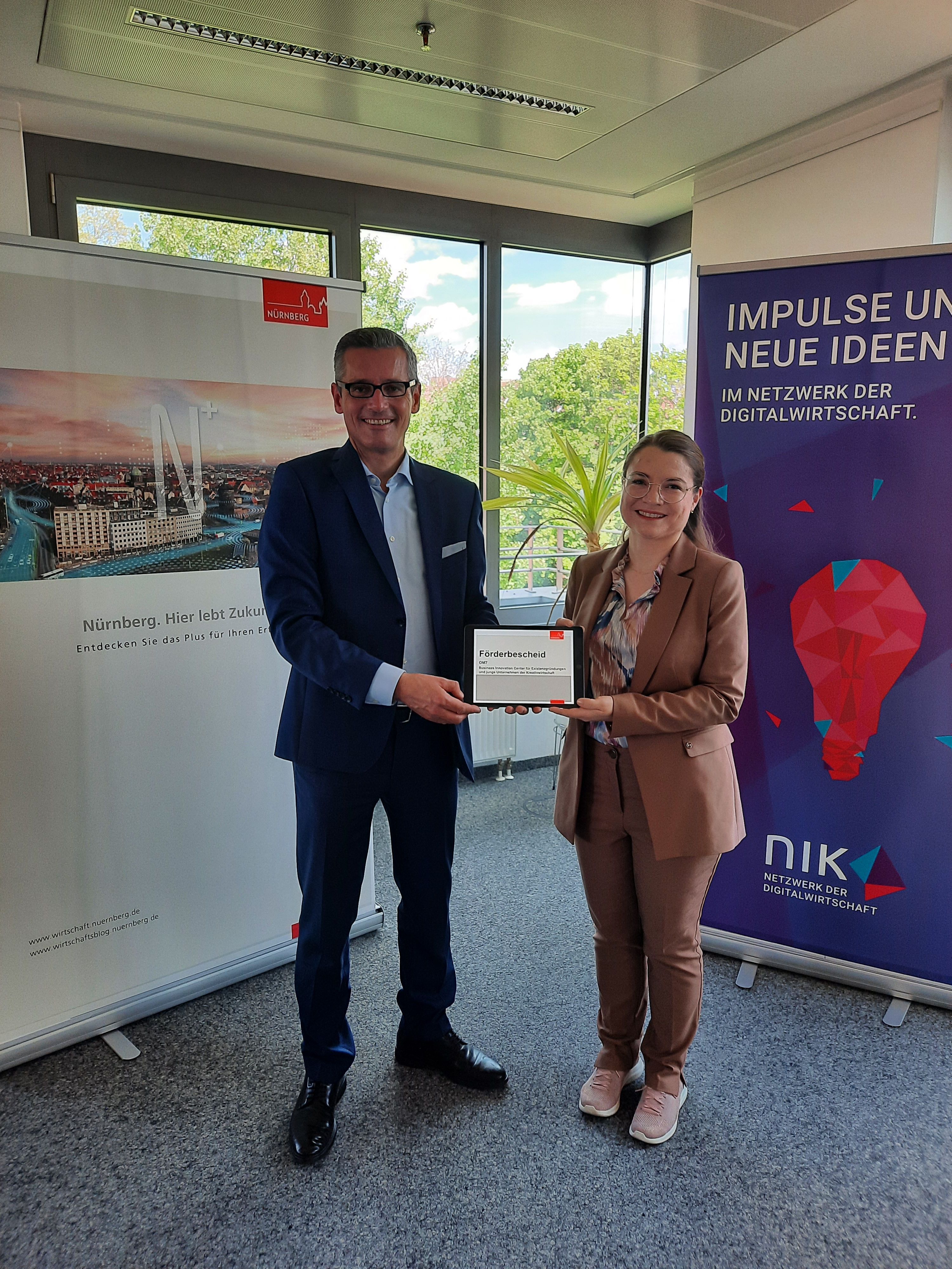 Wirtschafts- und Wissenschaftsreferent Dr. Michael Fraas hat am heutigen Mittwoch, 11. Mai 2022, den Förderbescheid für "OM7", ein Business Innovation Center für Existenzgründungen und junge Unternehmen der Kreativwirtschaft, an die Geschäftsführerin des Vereins Netzwerk der Digitalwirtschaft der Europäischen Metropolregion Nürnberg, NIK, Inci Strauß, übergeben. Das "OM7" soll im Herbst 2022 an den Start gehen und wird auf Dauer von fünf Jahren von der Stadt gefördert.