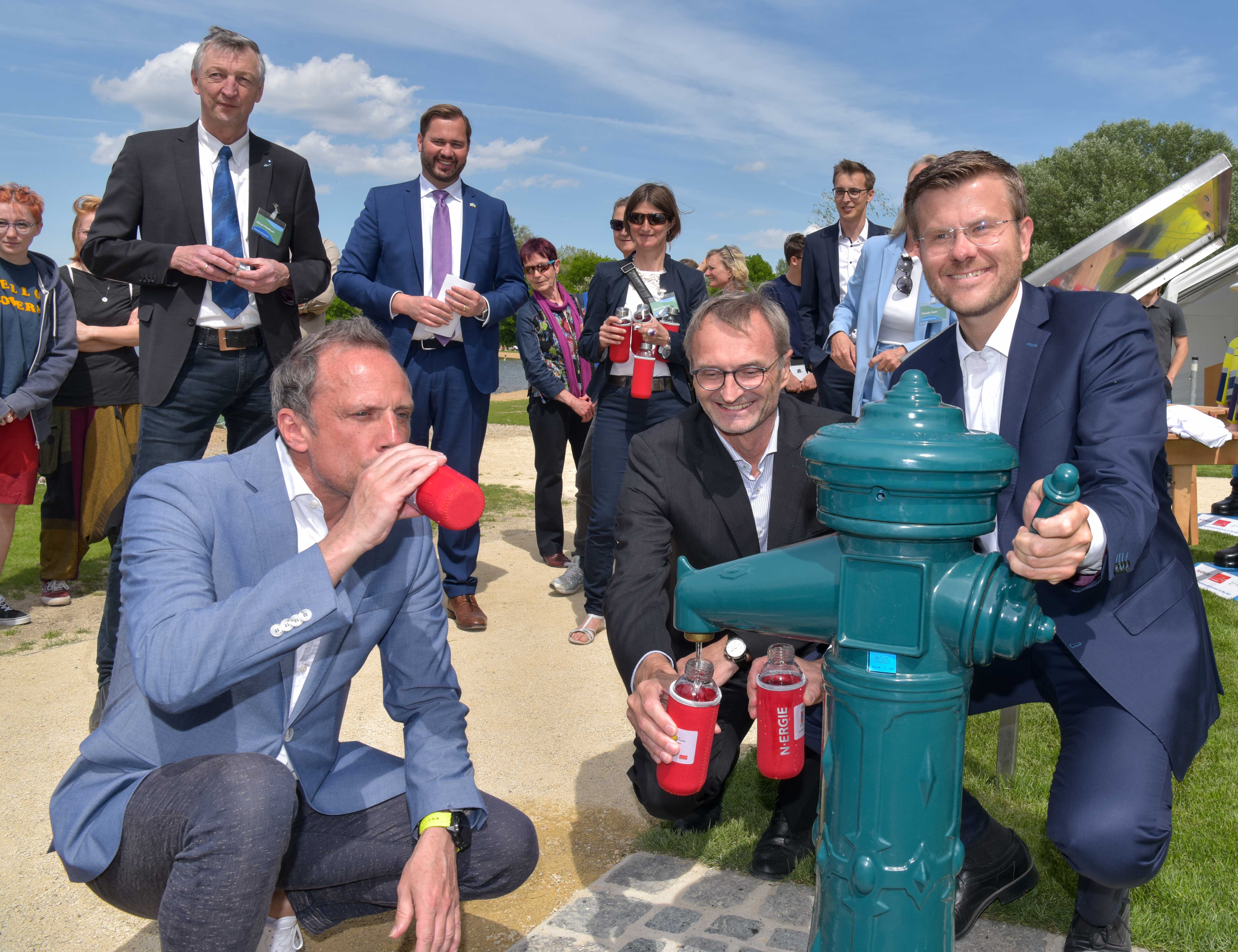 Inbetriebnahme des Menschenrechtsbrunnens am Wöhrder See am heutigen Freitag, 13. Mai 2022, von rechts: Oberbürgermeister Marcus König, Josef Hasler, Vorstandsvorsitzender der N-Ergie, und der bayerische Staatsminister für Umwelt- und Verbraucherschutz, Thorsten Glauber. Dahinter, von links: Ulrich Fitzthum, Leiter des Wasserwirtschaftsamts Nürnberg, und Jochen Kohler, Mitglied des Bayerischen Landtags.