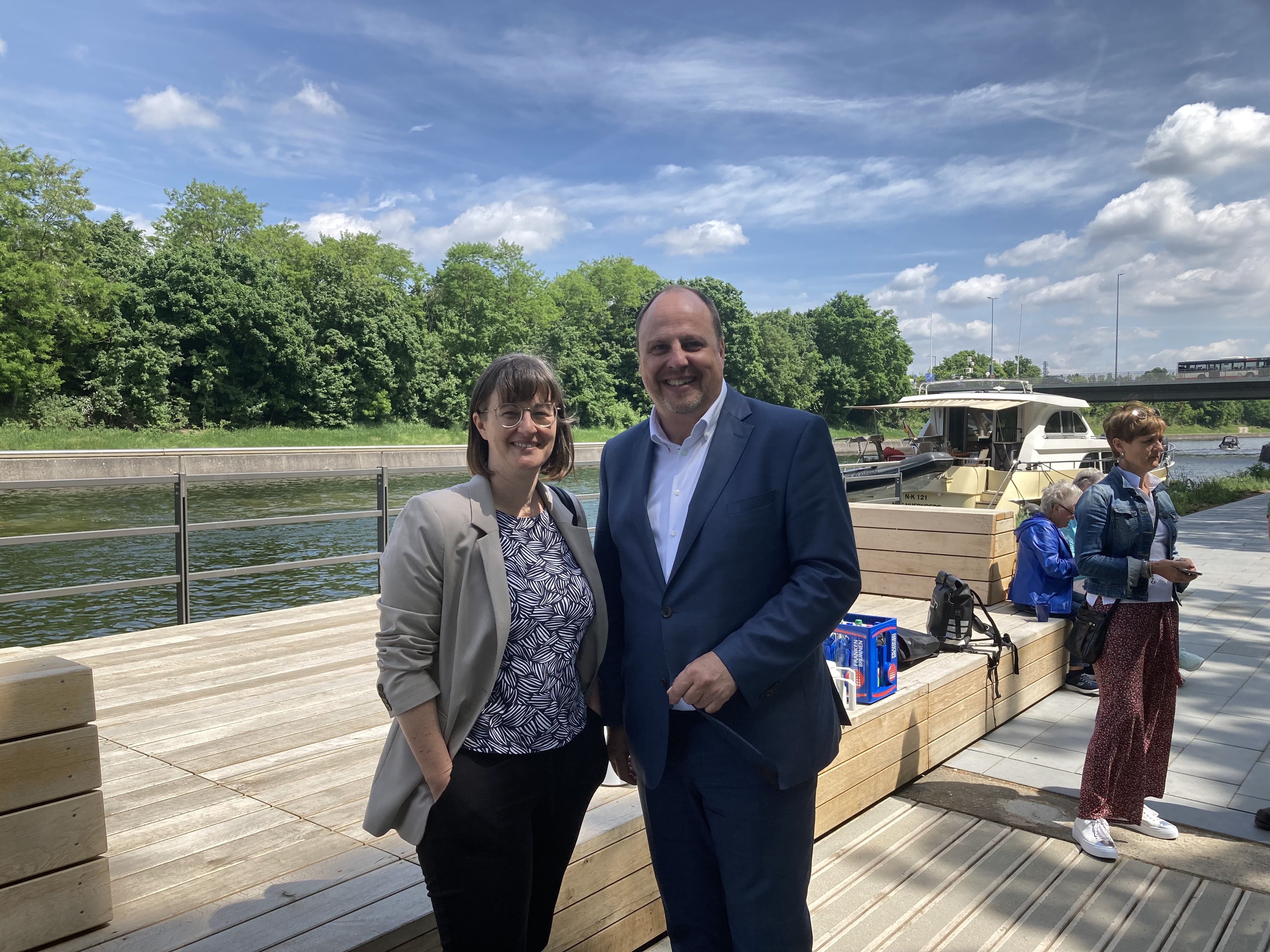 Bild Download: Umwelt- und Gesundheitsreferentin Britta Walthelm und Bürgermeister Christian Vogel an der neu gestalteten ehemaligen Anlegestelle am Aischweg.