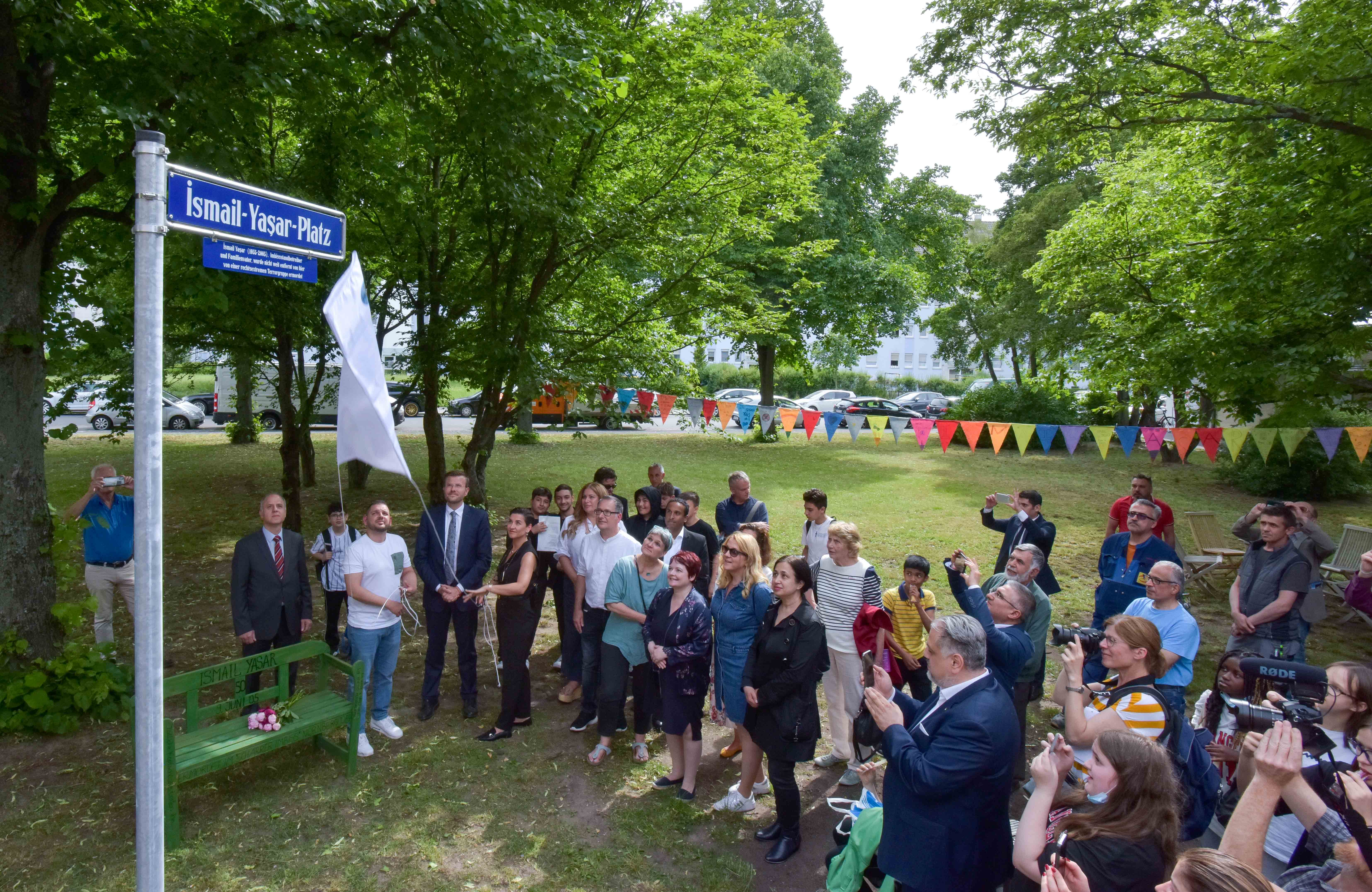 In Erinnerung an İsmail Yaşar, das sechste Mordopfer der rechtsextremen Terrorgruppe „Nationalsozialistischer Untergrund“ (NSU), wird die Grünanlage an der Ecke Lorschstraße / Bestelmeyerstraße / Velburger Straße als İsmail-Yaşar-Platz benannt. Oberbürgermeister Marcus König hat mit der Familie des ermordeten İsmail Yaşar und Prof. Barbara John, Ombudsfrau für die Angehörigen der Opfer des NSU, am heutigen Donnerstag, 2. Juni 2022, bei einer kleinen Gedenkzeremonie das Straßenschild enthüllt. Zudem wurde in unmittelbarer Nähe des Tatorts an der Scharrerstraße eine Gedenkstele aufgestellt sowie ein Walnussbaum – gestiftet vom Bündnis für Demokratie und Toleranz der Zwickauer Region – gepflanzt.