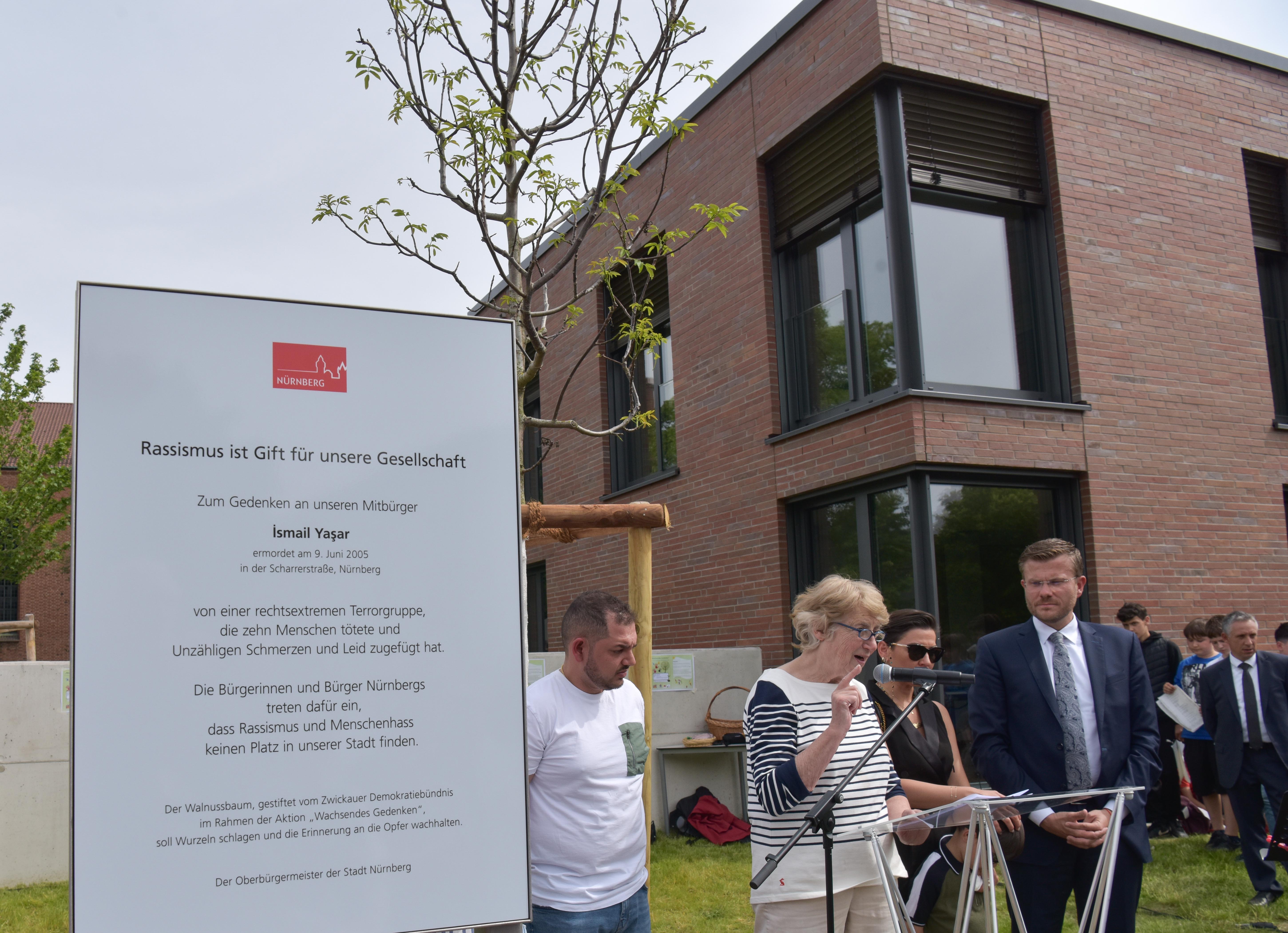 „Unsere Aufgabe als Gesellschaft ist es, miteinander ins Gespräch zu kommen und eine Gesellschaft zu bauen, in der jedes menschliche Leben beschützt und behütet wird“, sagte Prof. Barbara John, Ombudsfrau für die Angehörigen der Opfer des NSU. Im Zuge der Gedenkzeremonie für İsmail Yaşar wurde auch ein Walnussbaum – gestiftet vom Bündnis für Demokratie und Toleranz der Zwickauer Region – gepflanzt. „Wir freuen uns, dass der Baum in Nürnberg an so einem lebendigen Ort steht und ein kleiner Beitrag ist, Rassismus zu überwinden“, sagte Johannes Brandt, Koordinator des Bündnisses für Demokratie und Toleranz der Zwickauer Region. In Zwickau wohnten jahrelang Mitglieder des NSU. Seit 2021 setzt sich das Zwickauer Bündnis für Demokratie und Toleranz für Baumpflanzungen zum Gedenken an die Opfer des NSU in den jeweils betroffenen Städten ein. In engem Kontakt mit den Familien und den Stadtverwaltungen werden Bäume und Standorte gewählt, die als Erinnerungsort dienen sollen. maj