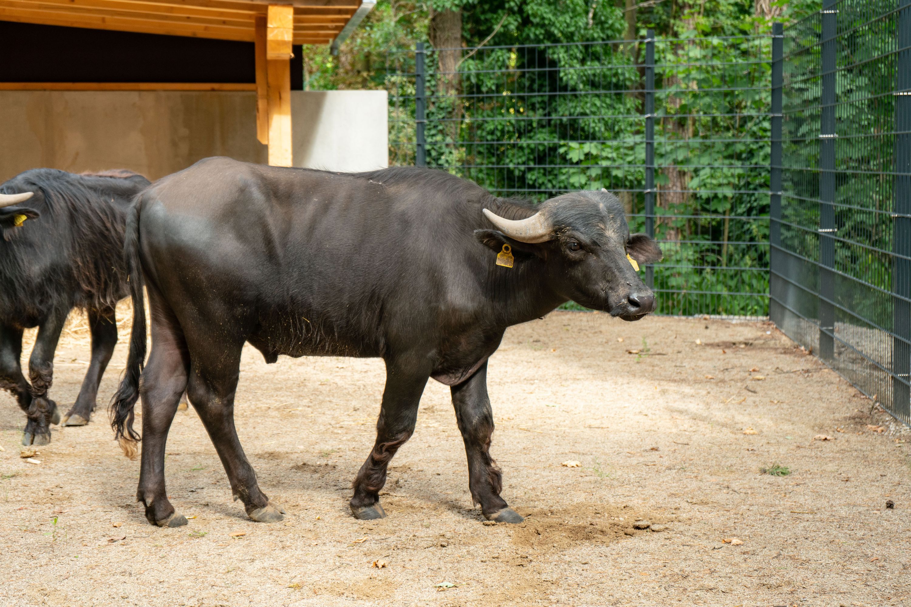 Im Tiergarten der Stadt Nürnberg ist seit dem heutigen Mittwoch, 3. August 2022, eine neue Tierart zu sehen: In einer neu gebauten Anlage im mittleren Abschnitt des Tiergartens sind zwei Hauswasserbüffel (Bubalus arnee f. bubalis) eingezogen. Die beiden Bullen kommen aus Österreich, genauer aus dem Tiergarten Schönbrunn in Wien und dem Nationalpark Neusiedler See. Die neue Anlage ist Teil der sogenannten Mittelspange. In diesem mittig gelegenen Teil des Tiergartens werden in den nächsten Jahren die bestehenden Gehege neu gestaltet und teilweise miteinander verbunden. Künftig sollen dort überwiegend bedrohte asiatische Tierarten in einer Art „tierischen Wohngemeinschaft“ leben. In einem ersten Schritt hat der Tiergarten die Anlage der Rentiere umgestaltet und dort nun die beiden Wasserbüffel angesiedelt.