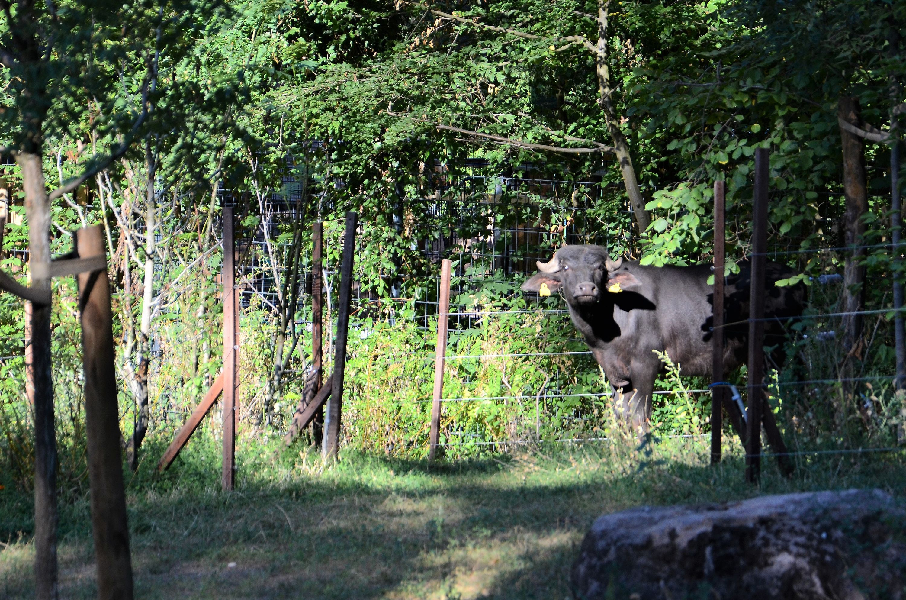 Einer der beiden Wasserbüffel bei seinem ersten Erkundungsgang über die neue Anlage.