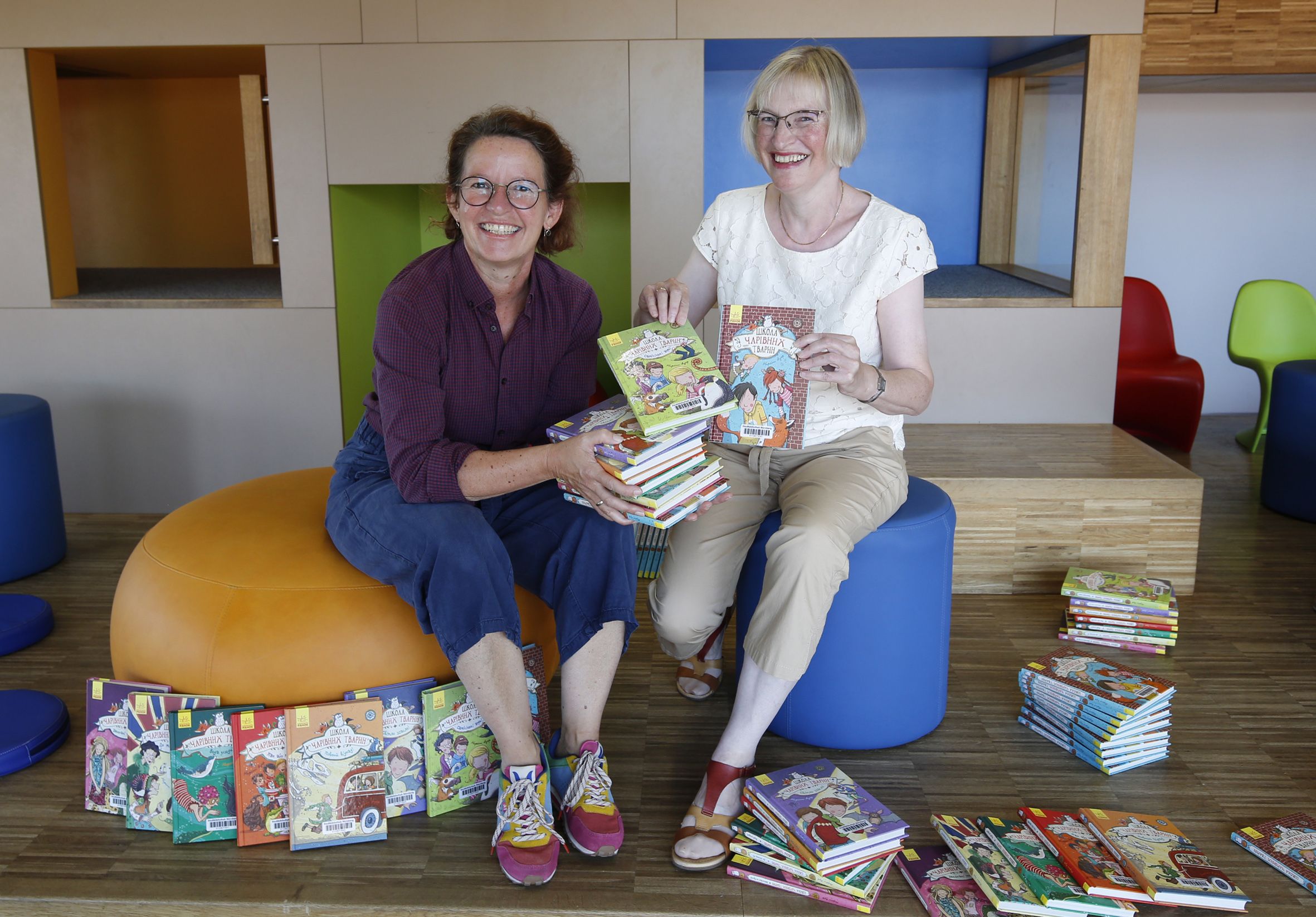 Margit Auer (links) schenkt der Direktorin der Stadtbibliothek, Elisabeth Sträter, 68 Bücher von „Die Schule der magischen Tiere“ auf Ukrainisch für die Kinderbibliothek.