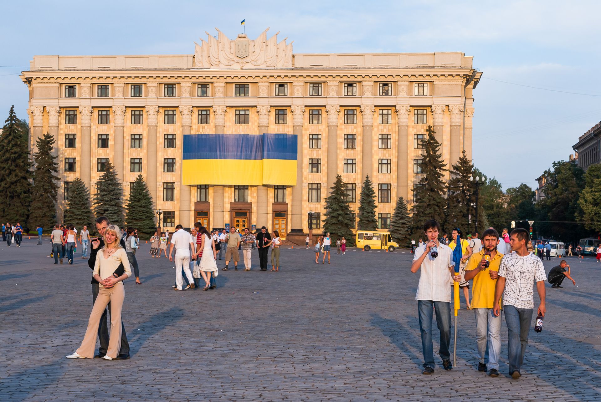Fußgänger auf dem östlichen Teil des Platzes der Freiheit in Charkiw, im Hintergrund das Verwaltungsgebäude der Stadt Charkiw, aufgenommen im August 2006
