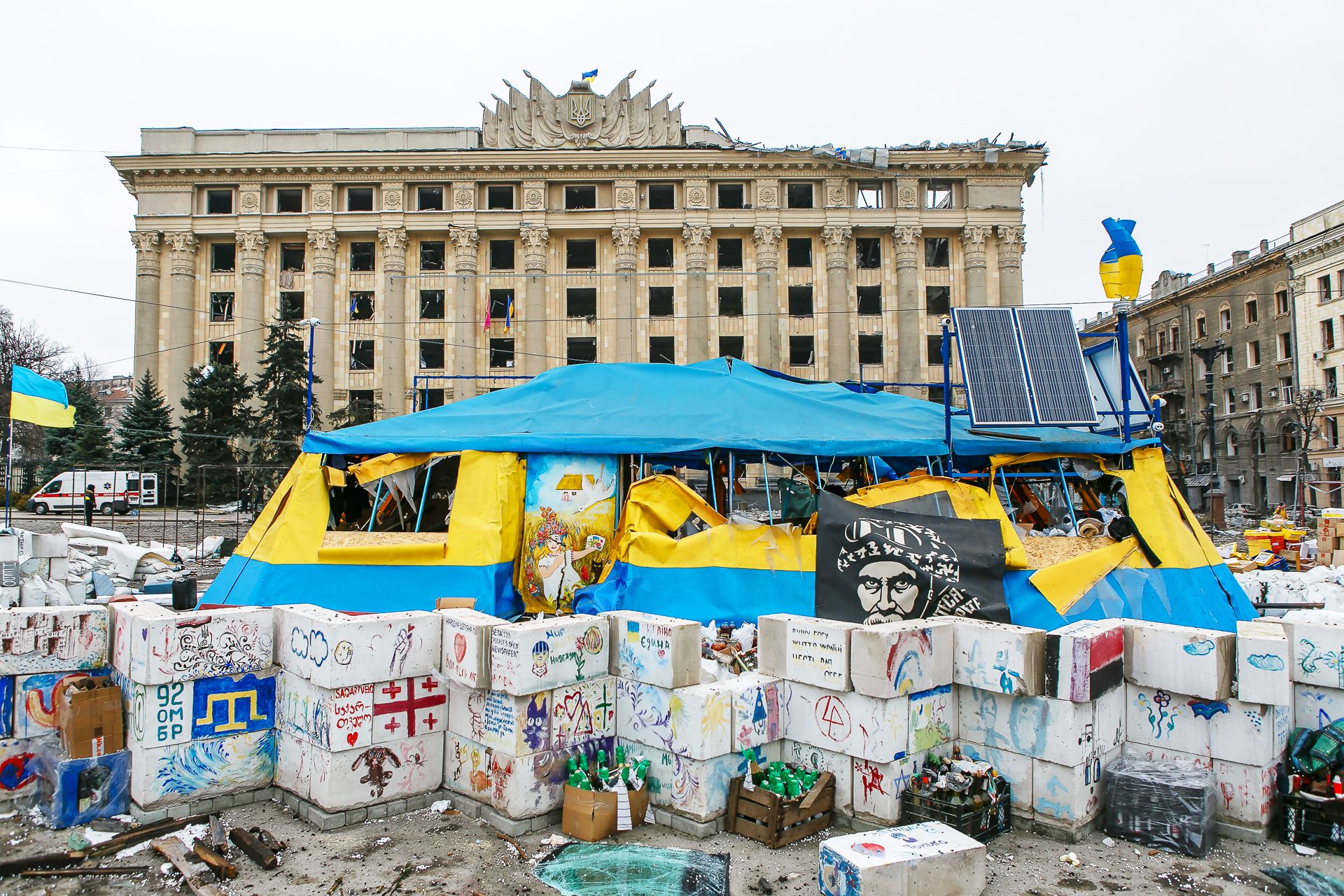 Barrikaden auf dem Platz der Freiheit in Charkiw, im Hintergrund das demolierte Verwaltungsgebäude der Stadt Charkiw, aufgenommen im März 2022
