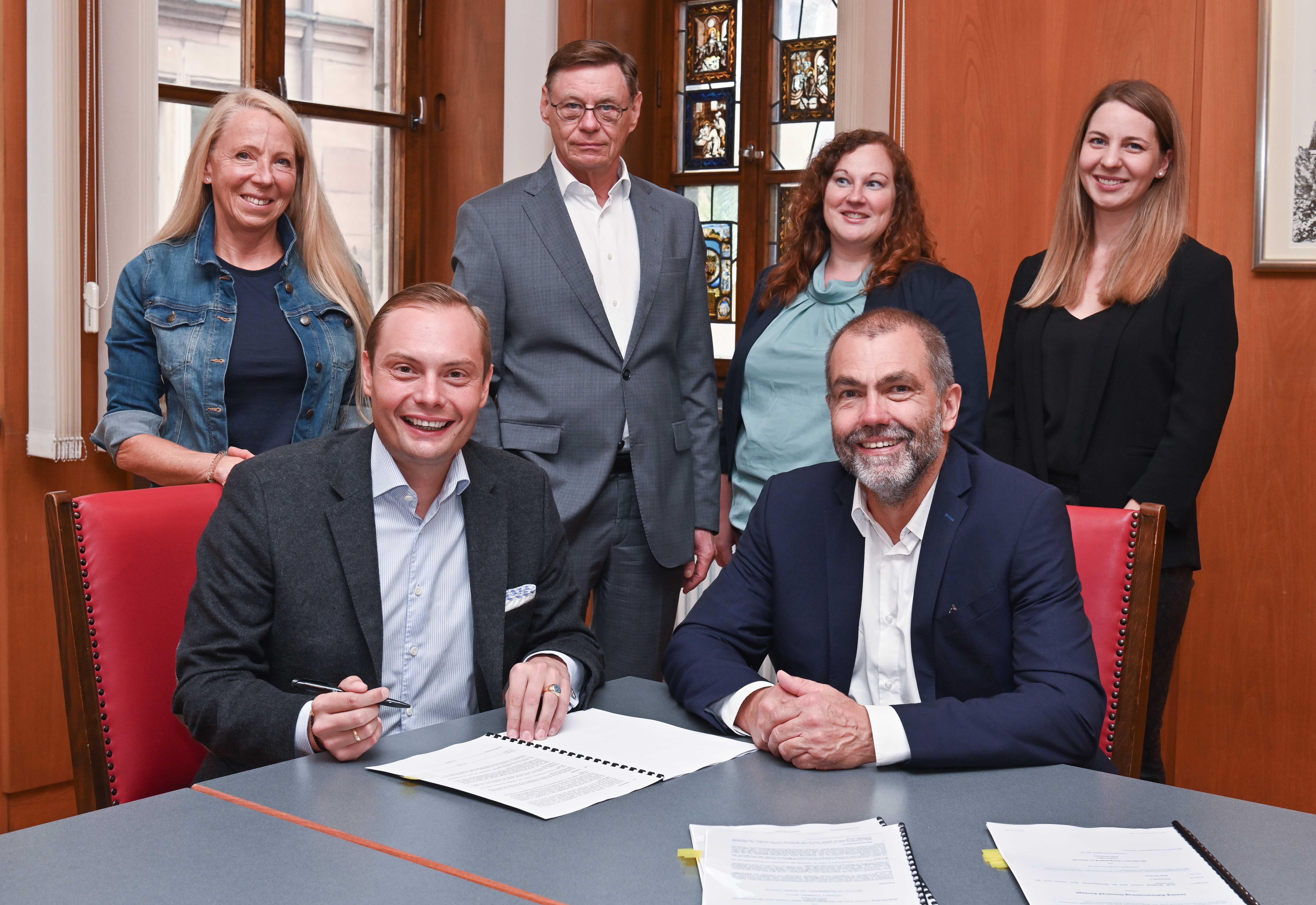 Stadtkämmerer Harald Riedel und der Geschäftsführer der Anbieterin DD Deutsche Dienstrad GmbH, Maximilian Diem, unterzeichnen den Vertrag. Hintere Reihe v.l.: stellvertretende Vorsitzende des Gesamtpersonalrats, Gabi Jena, Rolf Hahn von der DD Deutsche Dienstrad GmbH, Nina Krasa und Marleen Greiner vom Personalamt der Stadt Nürnberg.