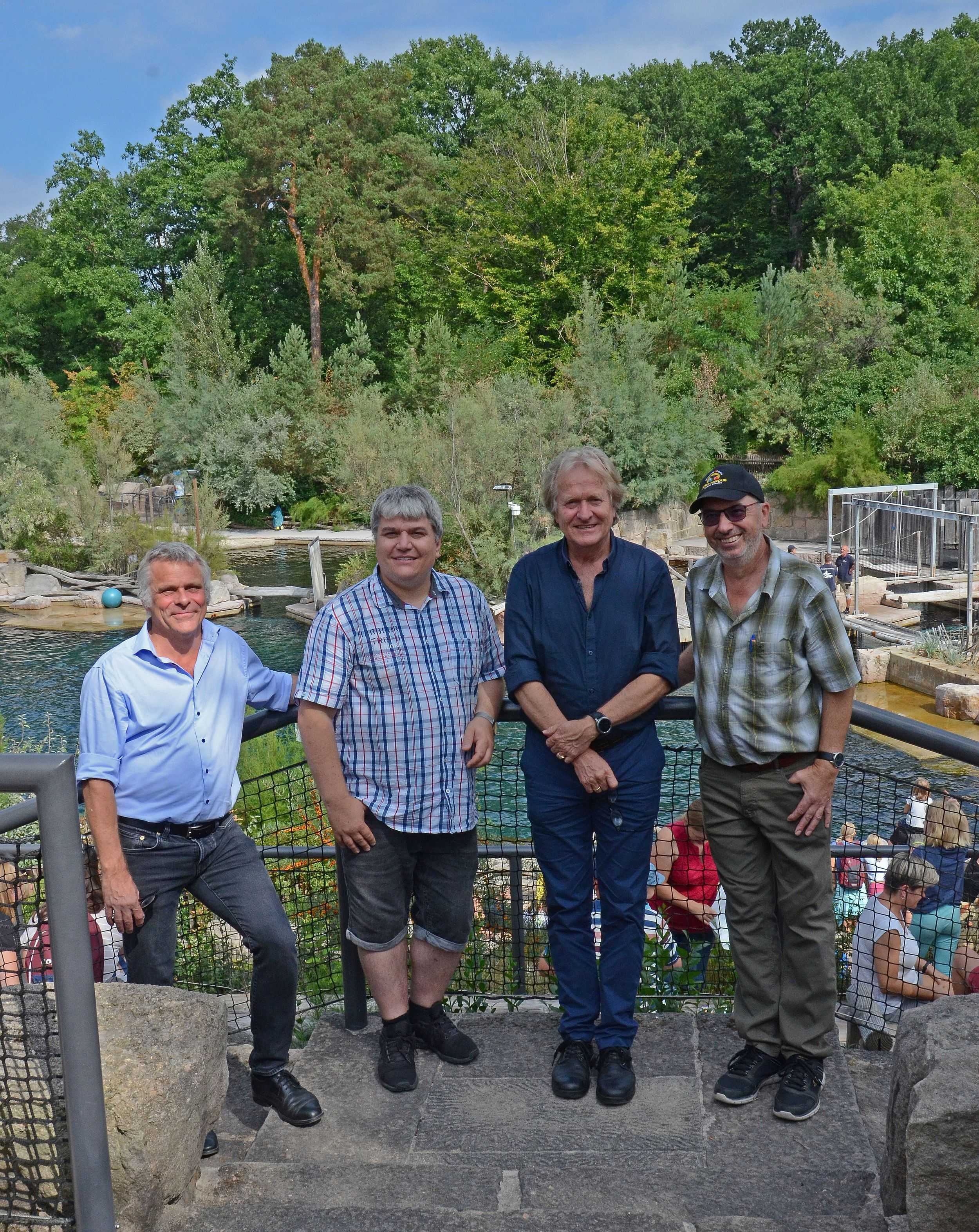 Tiergartendirektor Dr. Dag Encke, Stefan Schmidt, Bundestagsabgeordneter für Bündnis 90/Die Grünen aus Regensburg, Dr. Lorenzo von Fersen, Kurator für Forschung und Artenschutz im Tiergarten, und Wolfgang Rades, Artenschutzbeauftragter des Loro Parque auf Teneriffa, (v.li.) nach einer Präsentation vor der Delfinlagune.