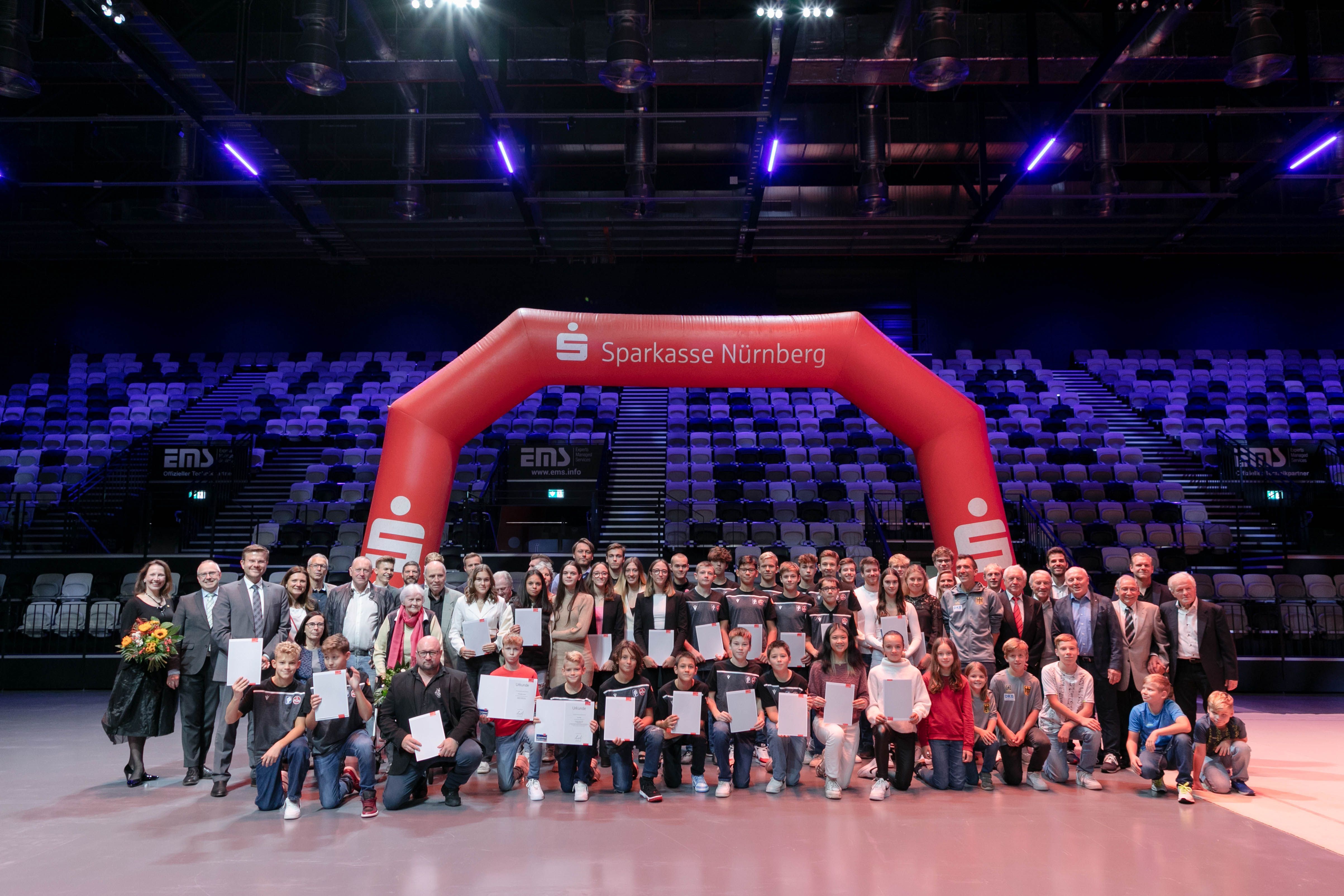 101 Jahre Nürnberger Sport – Gruppenfoto der geehrten Sportlerinnen und Sportler aus Nürnberg in der KIA Metropolarena.