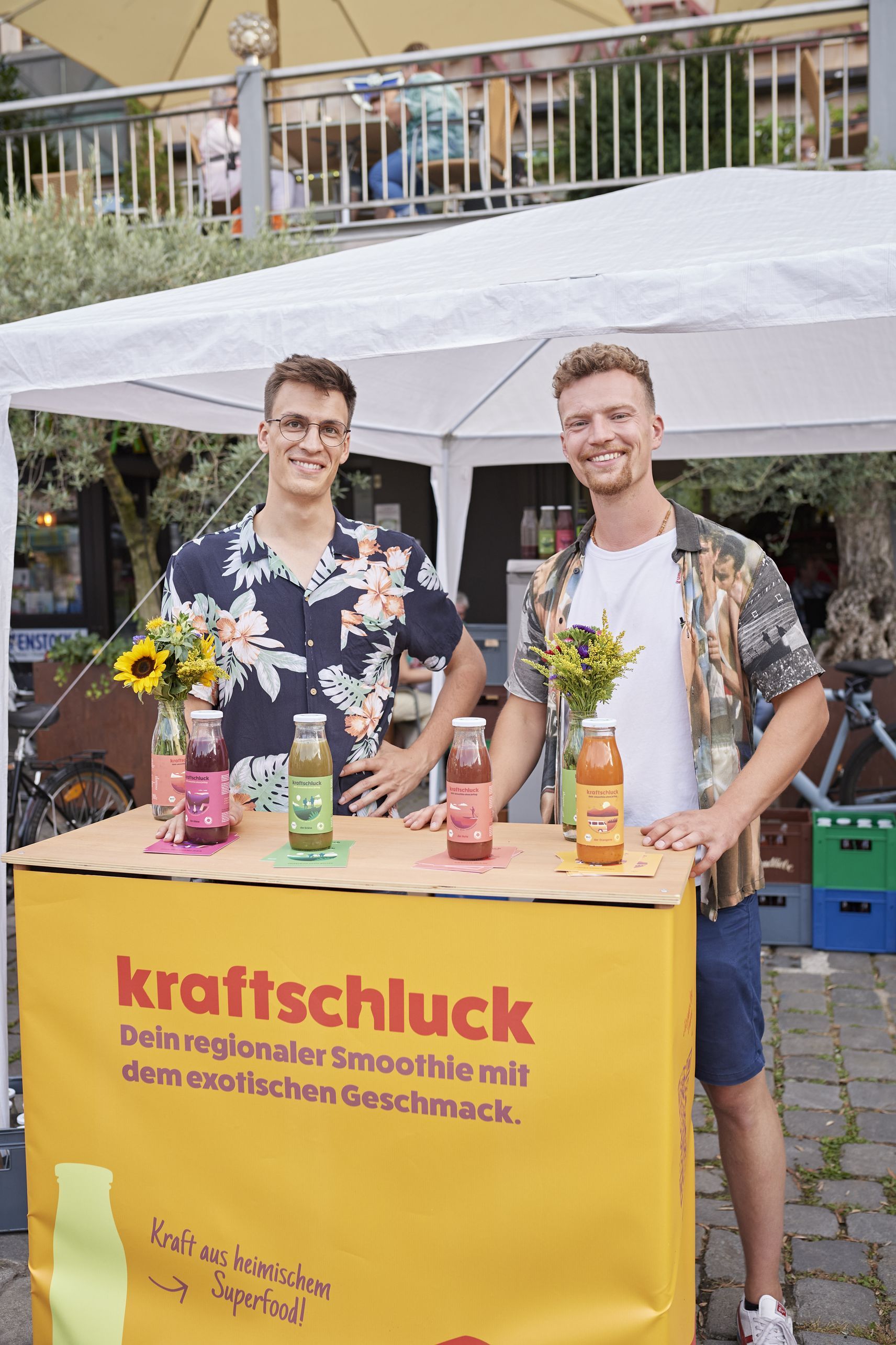 Die Gründer von Kraftschluck, Philipp Köstler und Florian Weiß (von links), präsentieren ihren Bio-Smoothie „ohne Jetlag“ auf dem AgriKulturfest im Juli 2022 am Hauptmarkt. Beide Projekte – Bio-Smoothie und AgriKulturfest – wurden 2022 durch die Öko-Modellregion gefördert.