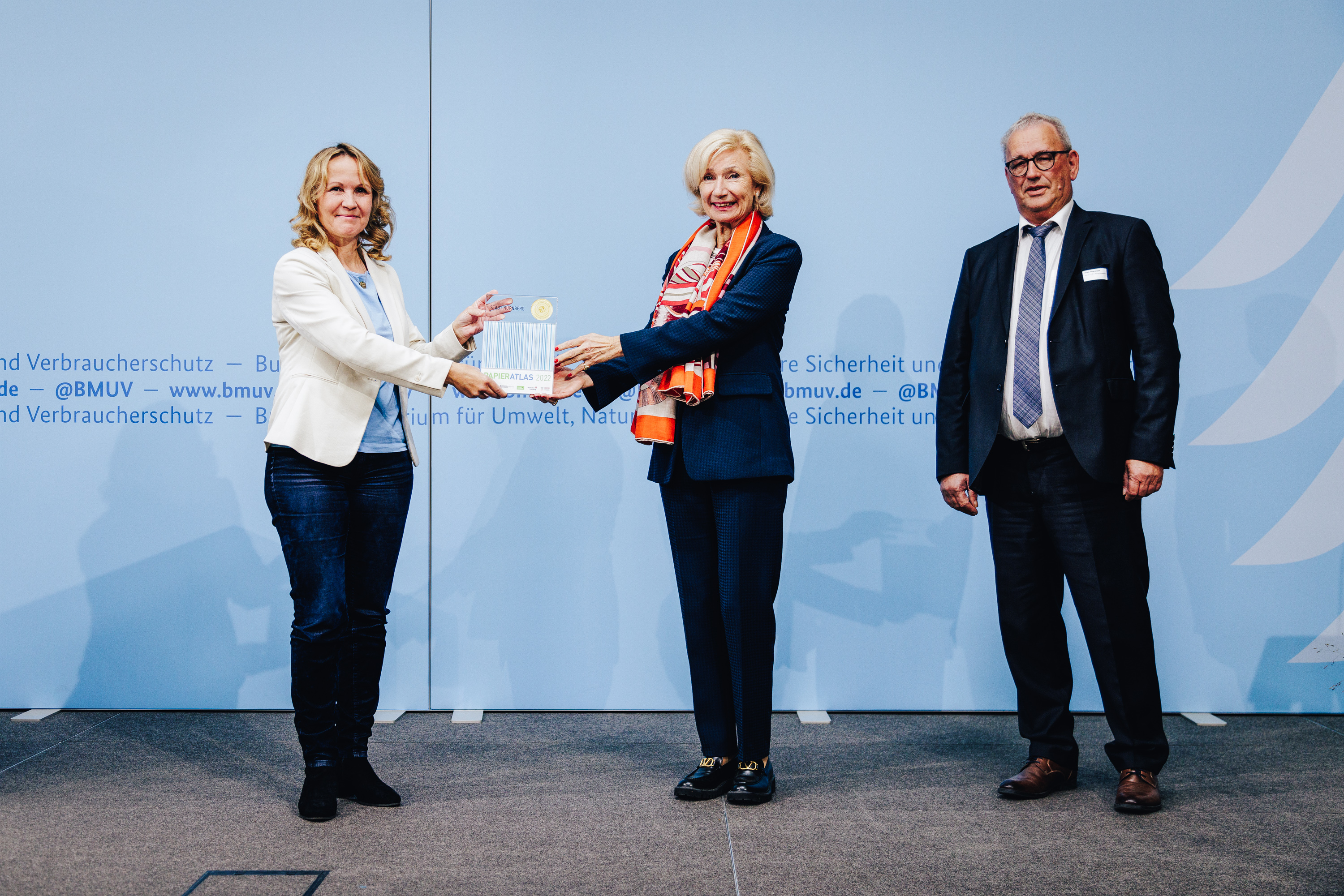Bürgermeisterin Prof. Dr. Julia Lehner (Mitte) nimmt die Auszeichnung von Bundesumweltministerin Steffi Lemke und IPR-Sprecher Ulrich Feuersinger entgegen.