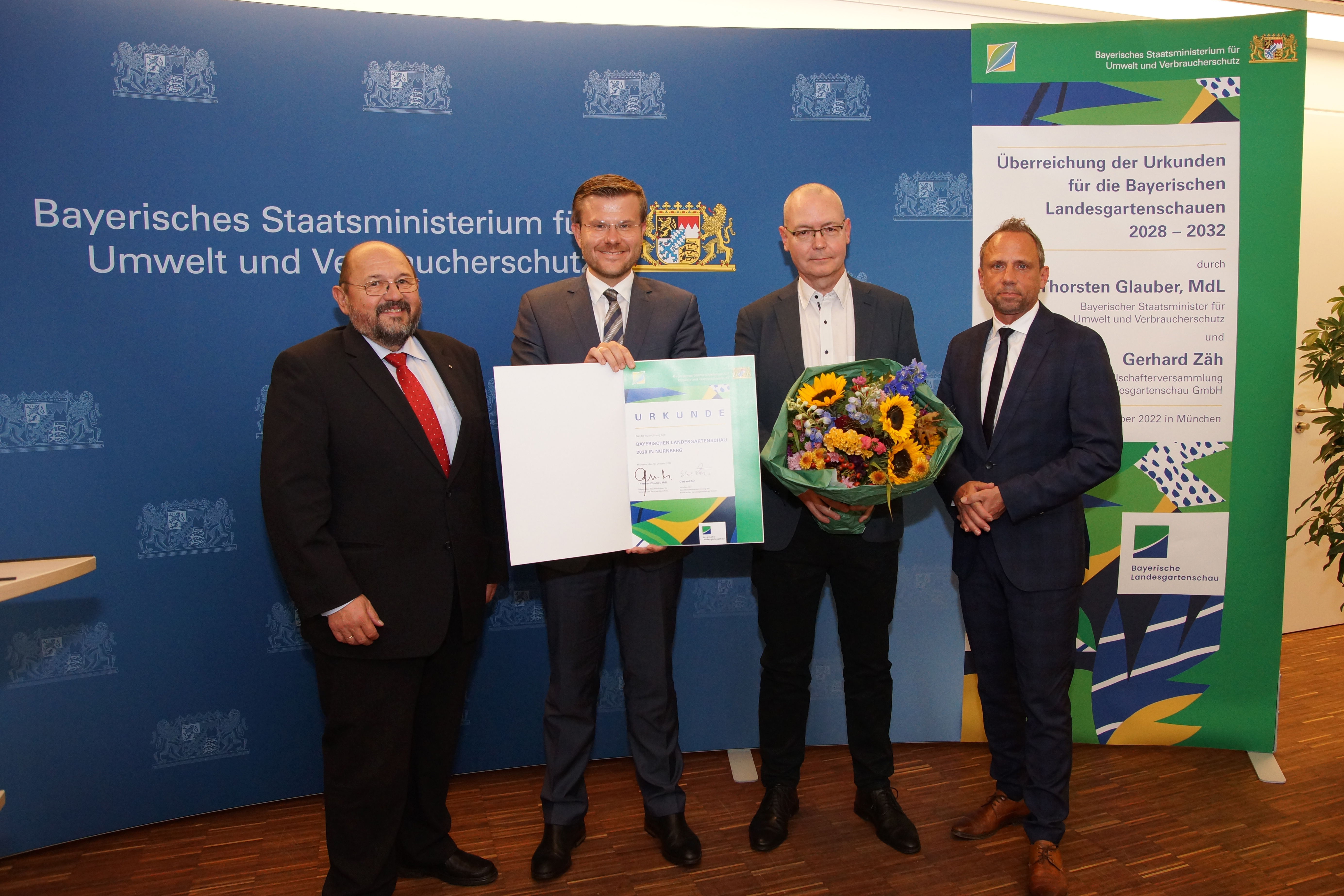 Bayerns Umweltminister Thorsten Glauber (re.) und Gerhard Zäh, Vorsitzender der Gesellschafterversammlung der Bayerischen Landesgartenschau GmbH, haben Oberbürgermeister Marcus König (2. v.li.) und Projektleiter Johannes Hinnecke aus dem Bürgermeisteramt die Austragungsurkunde für die Landesgartenschau 2030 in Nürnberg überreicht.