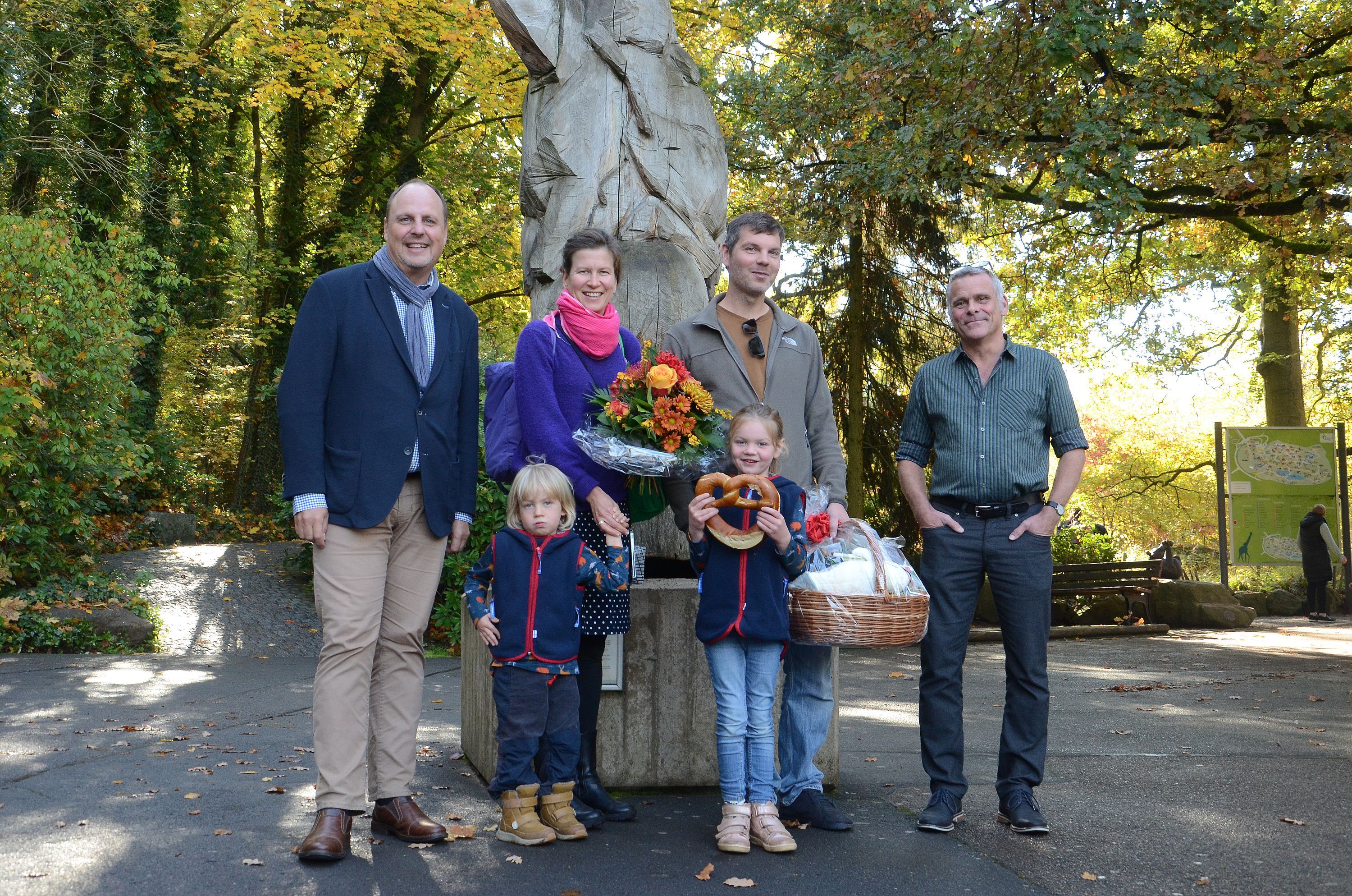 Bürgermeister Christian Vogel (links) und Tiergartendirektor Dr. Dag Encke (rechts) überraschen Familie Elsner zunächst am Eingang mit einem Blumenstrauß und einem Geschenkkorb.