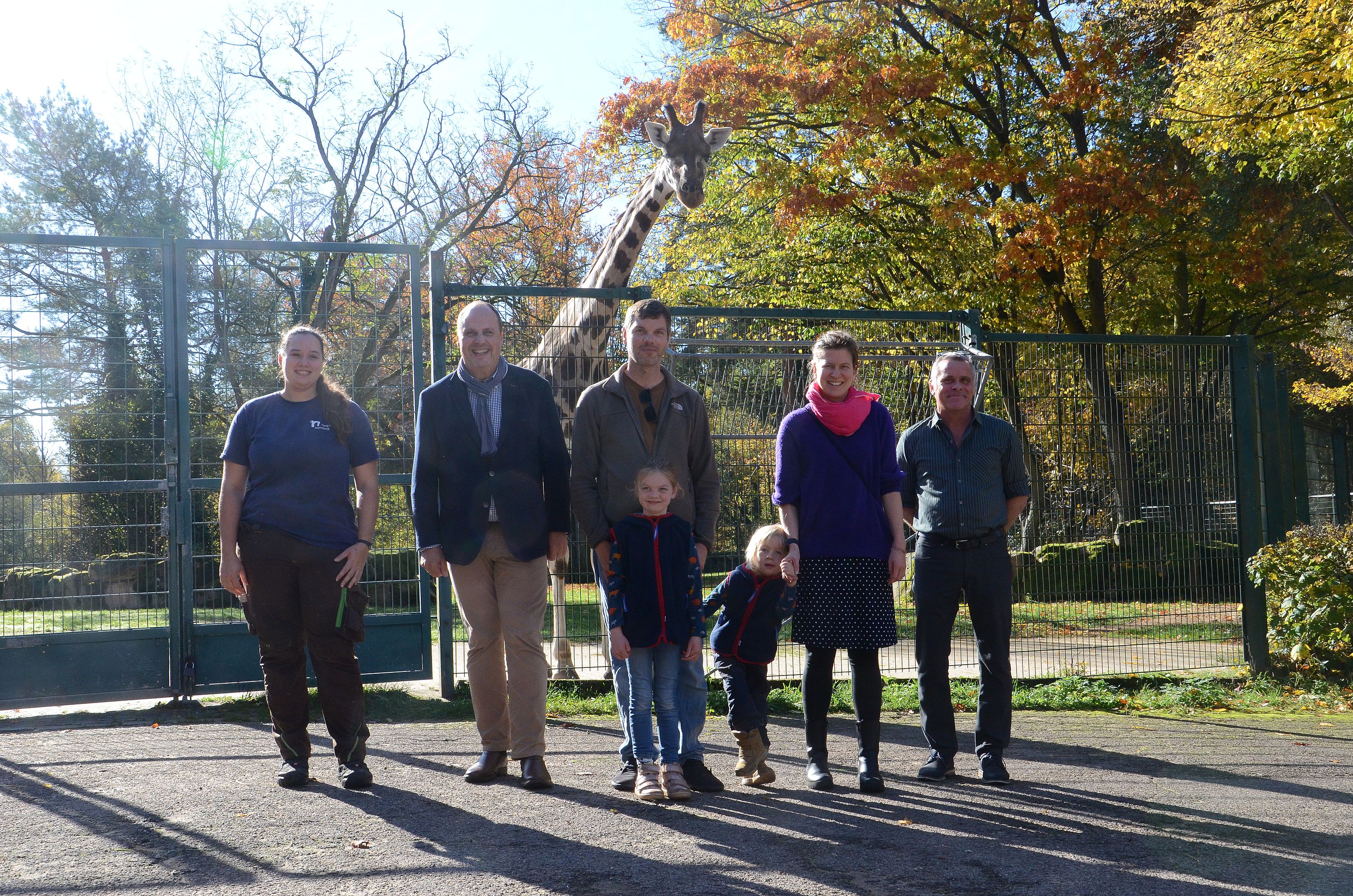 An der Giraffenanlage dürfen die Jubiläumsgäste beim Füttern der Tiere helfen. Diesen Tiergartenbesuch wird Familie Elsner nicht so schnell vergessen. Auf dem Bild (von links): Tierpflegerin Nadine Lang, Bürgermeister Christian Vogel, Familie Elsner und Tiergartendirektor Dr. Dag Encke.