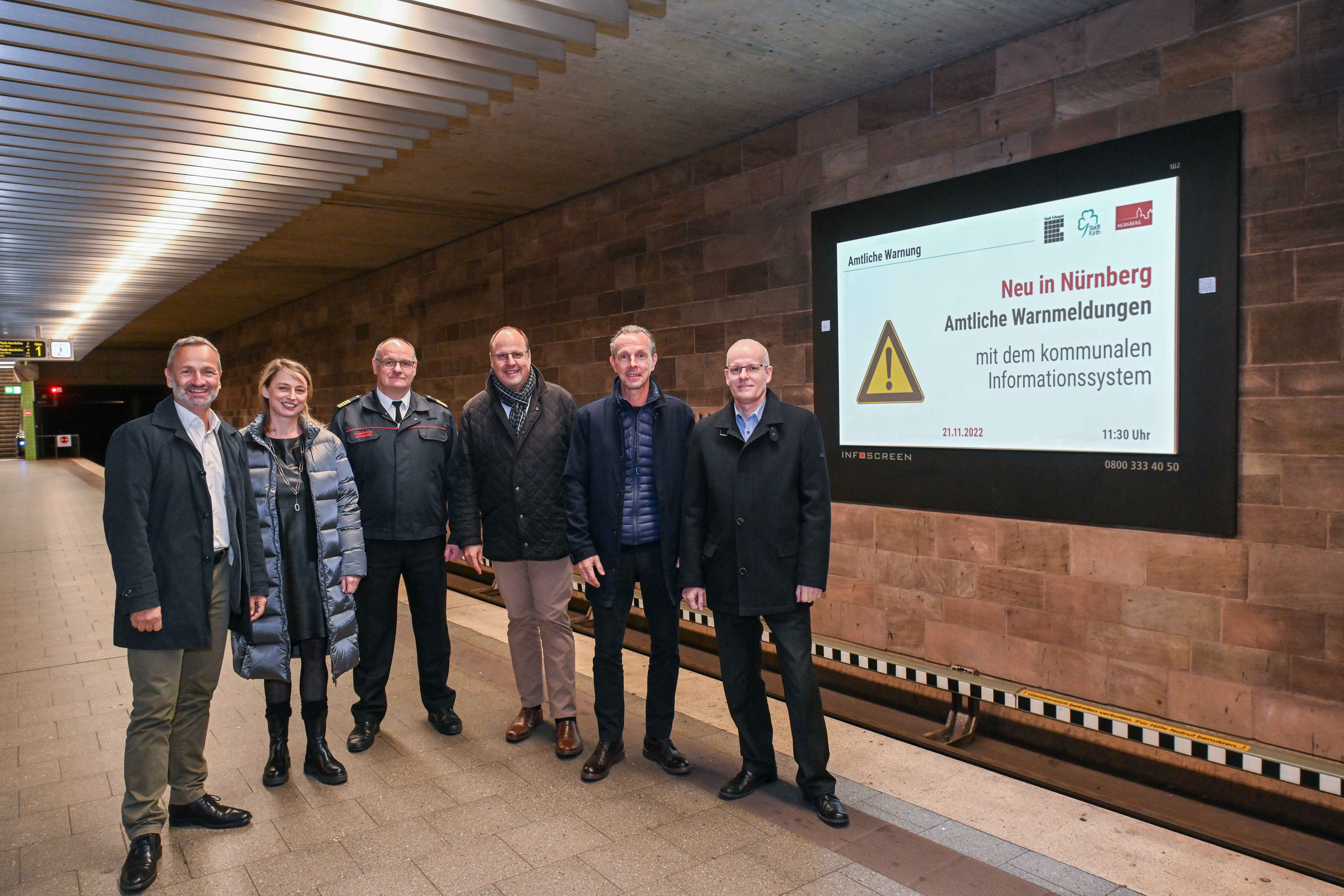 Die Integrierte Leitstelle der Berufsfeuerwehr Nürnberg alarmiert die Bevölkerung bei Gefahrenlagen über verschiedene Wege wie Warn-Apps und Sirenen. Nun kommt eine weitere Möglichkeit hinzu: Zukünftig können Warnmeldungen auch über Infoscreens in U-Bahnhöfen und Einkaufszentren direkt an die Bevölkerung gerichtet werden.