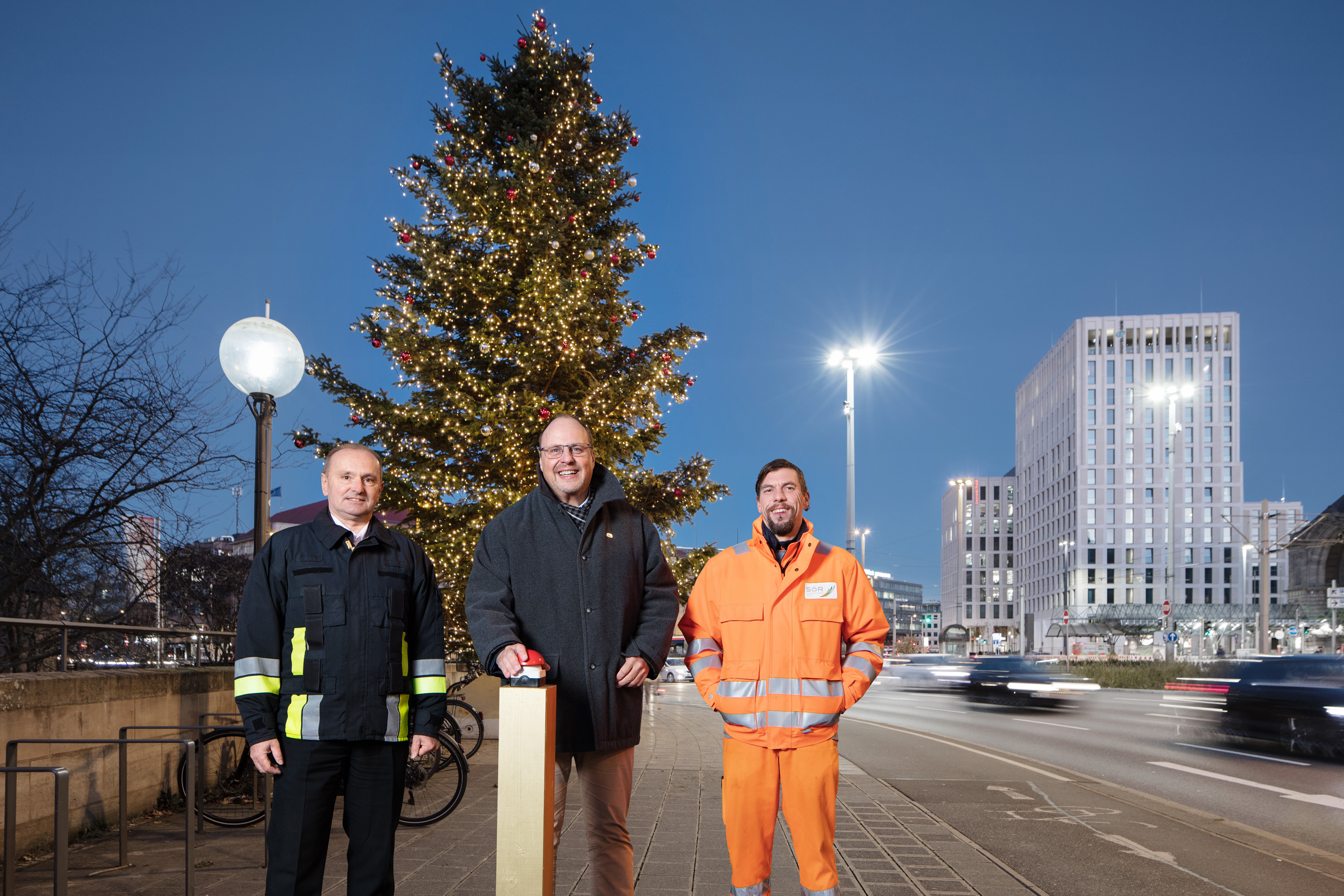 Der Leiter der Feuerwache 4, Horst Gillmeier, Bürgermeister und Erster Sör-Werkleiter Christian Vogel und Christian Helbig von der Sör-Abteilung Straßenbeleuchtung sorgen dafür, dass der Weihnachtsbaum der Stadt Nürnberg auch in diesem Jahr wieder leuchtet (v.l.n.r.).