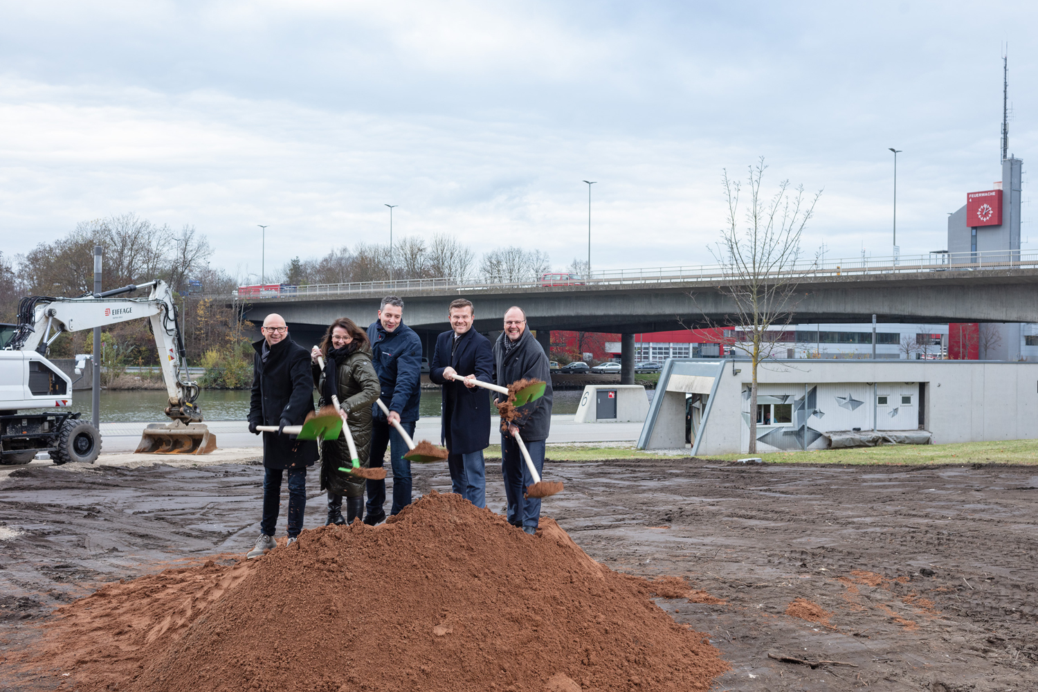 Erster Spatenstich beim Projekt Hafenbrücken (v.l.n.r.): Guido Zander, Leiter des Wasserstraßen- und Schifffahrtsamts Nürnberg-Regensburg, die Regierungsvizepräsidentin von Mittelfranken, Birgit Riesner, der Sör-Projektleiter Hafenbrücken, Bernhard Homering, Oberbürgermeister Marcus König, Bürgermeister Christian Vogel.
