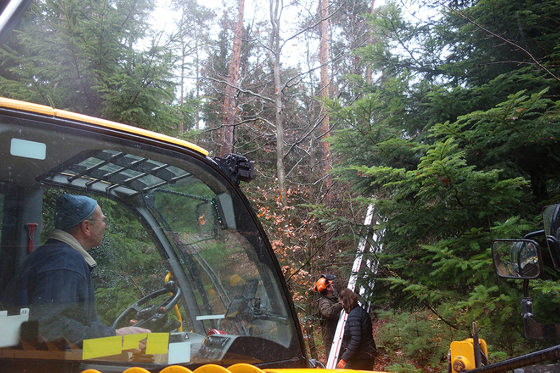 Eine Tiergartenmitarbeiterin und ein Tiergartenmitarbeiter holen nach Rücksprache mit den Bayerischen Staatsforsten im November 2022 eine Weihnachtstanne für den Tiergarteneingang aus dem Wald.