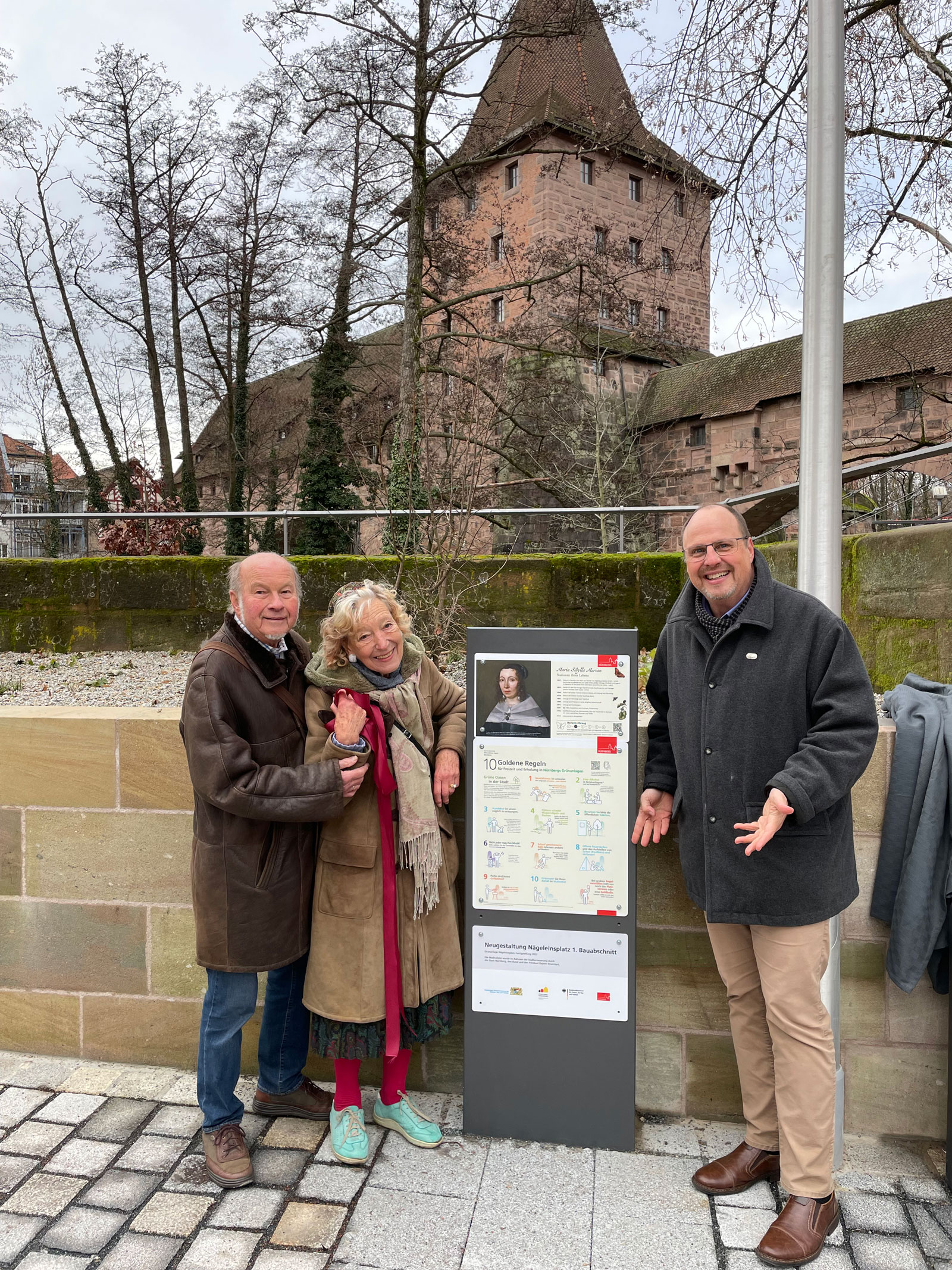 Der Servicebetrieb Öffentlicher Raum Nürnberg (Sör) hat einen Merianin-Uferweg beschildert. Sechs Schautafeln entlang der Pegnitz zeigen das Leben und Wirken von Maria Sibylla Merian (1647 bis 1717). Bürgermeister und Erster Sör-Werkleiter Christian Vogel enthüllte am Dienstag, 10. Januar 2023, gemeinsam mit Margot und Dieter Lölhöffel eine der Schautafeln am Nägeleinsplatz. Das Ehepaar Lölhöffel, das sich seit vielen Jahren für das Andenken an die lange Zeit in Nürnberg tätige Pflanzen- und Insektenforscherin sowie anerkannte Künstlerin Maria Sibylla Merian engagiert, hatte die Errichtung der Schautafeln angeregt.