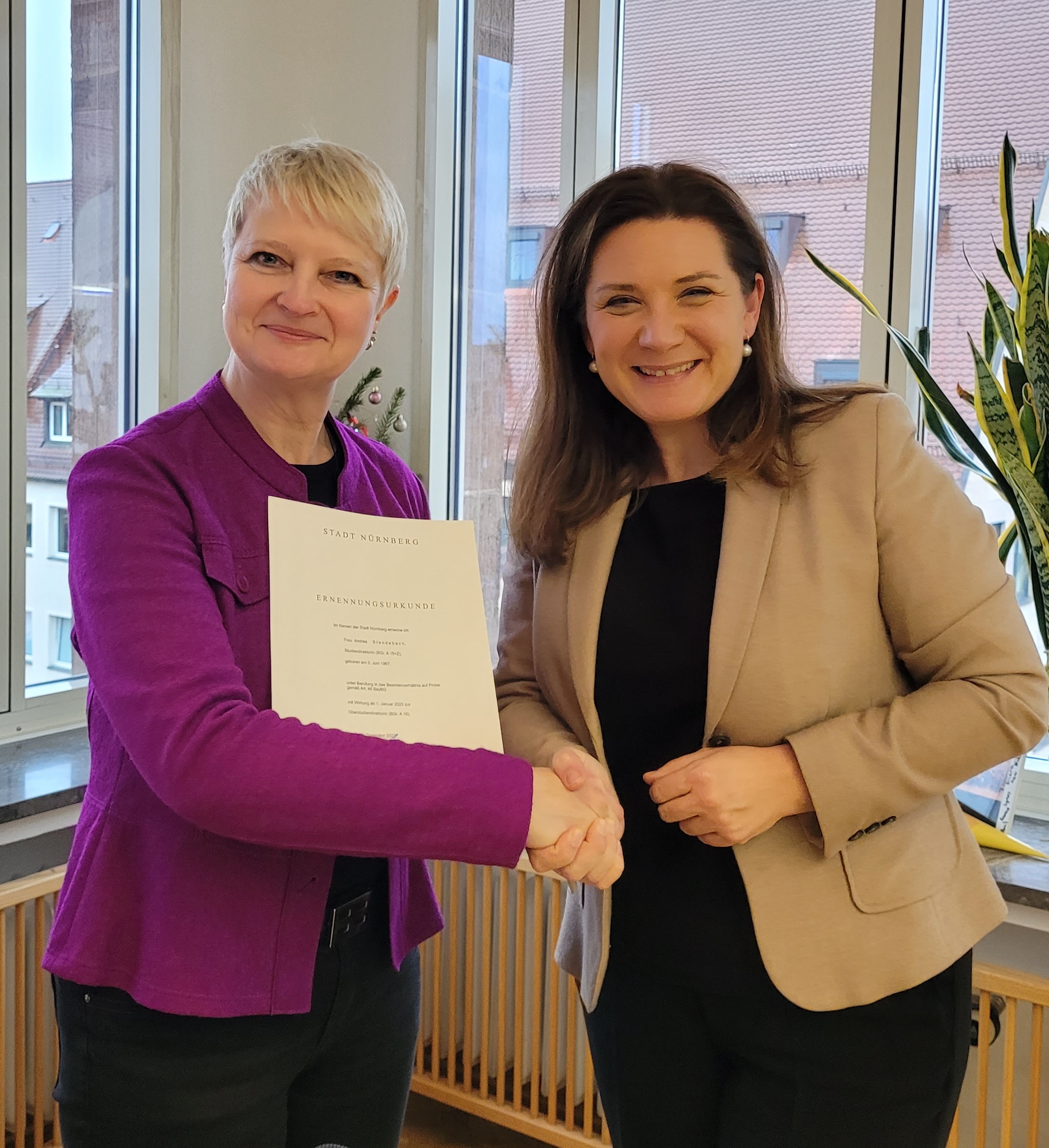 Andrea Stendebach, neue Schulleitung der B5, mit Schulreferentin Cornelia Trinkl (v.l.n.r.).