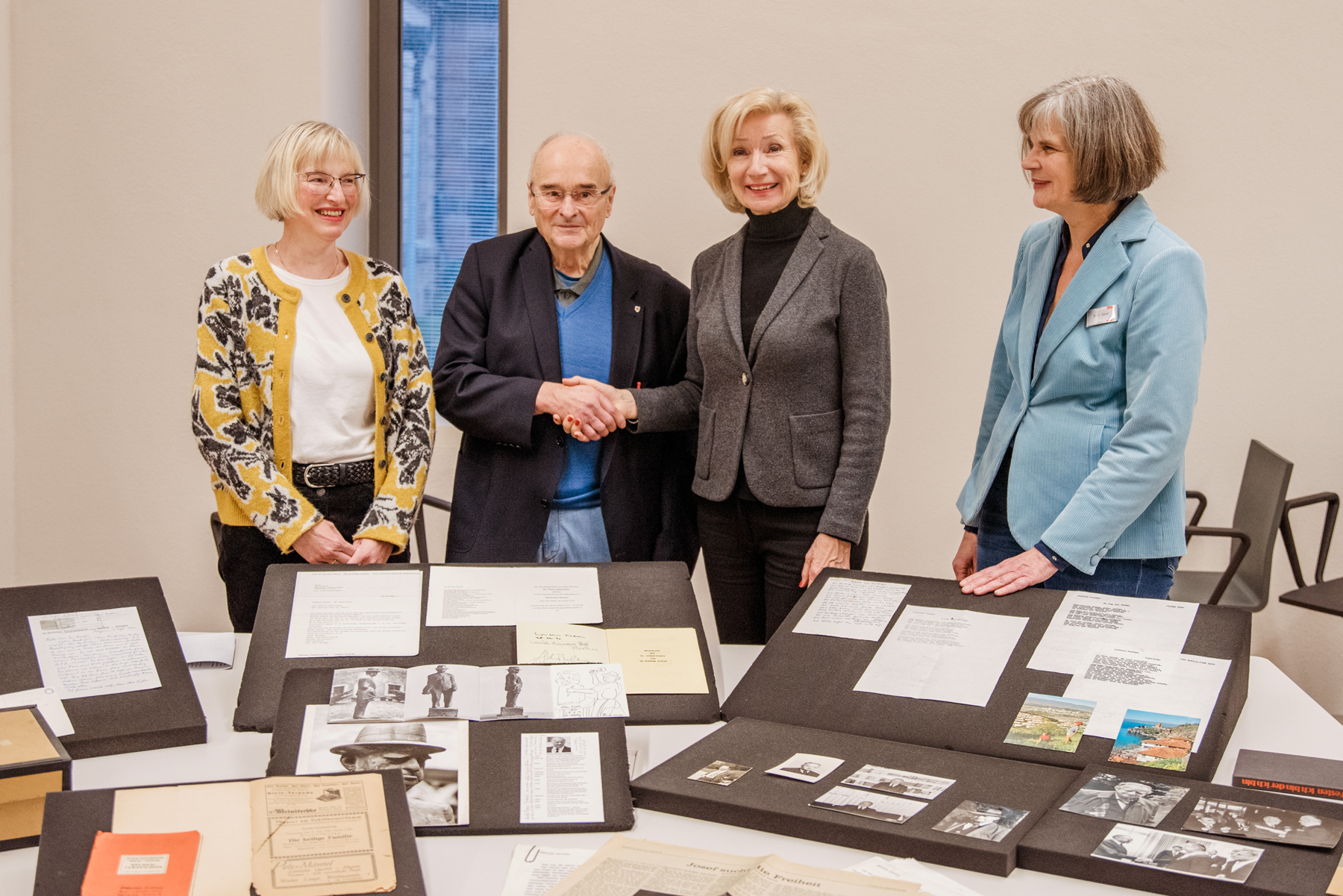 Manfred Schreiner, Vorsitzender der Hermann-Kesten-Gesellschaft in Nürnberg, übergab der Stadtbibliothek etliche biografische Dokumente zu Hermann Kesten. Elisabeth Sträter, Direktorin der Stadtbibliothek, Prof. Dr. Julia Lehner, Zweite Bürgermeisterin der Stadt Nürnberg, und Dr. Christine Sauer, Leiterin der Historisch-Wissenschaftlichen Stadtbibliothek (v.l.n.r.), nahmen die Stücke im Lesesaal der Stadtbibliothek Zentrum entgegen.