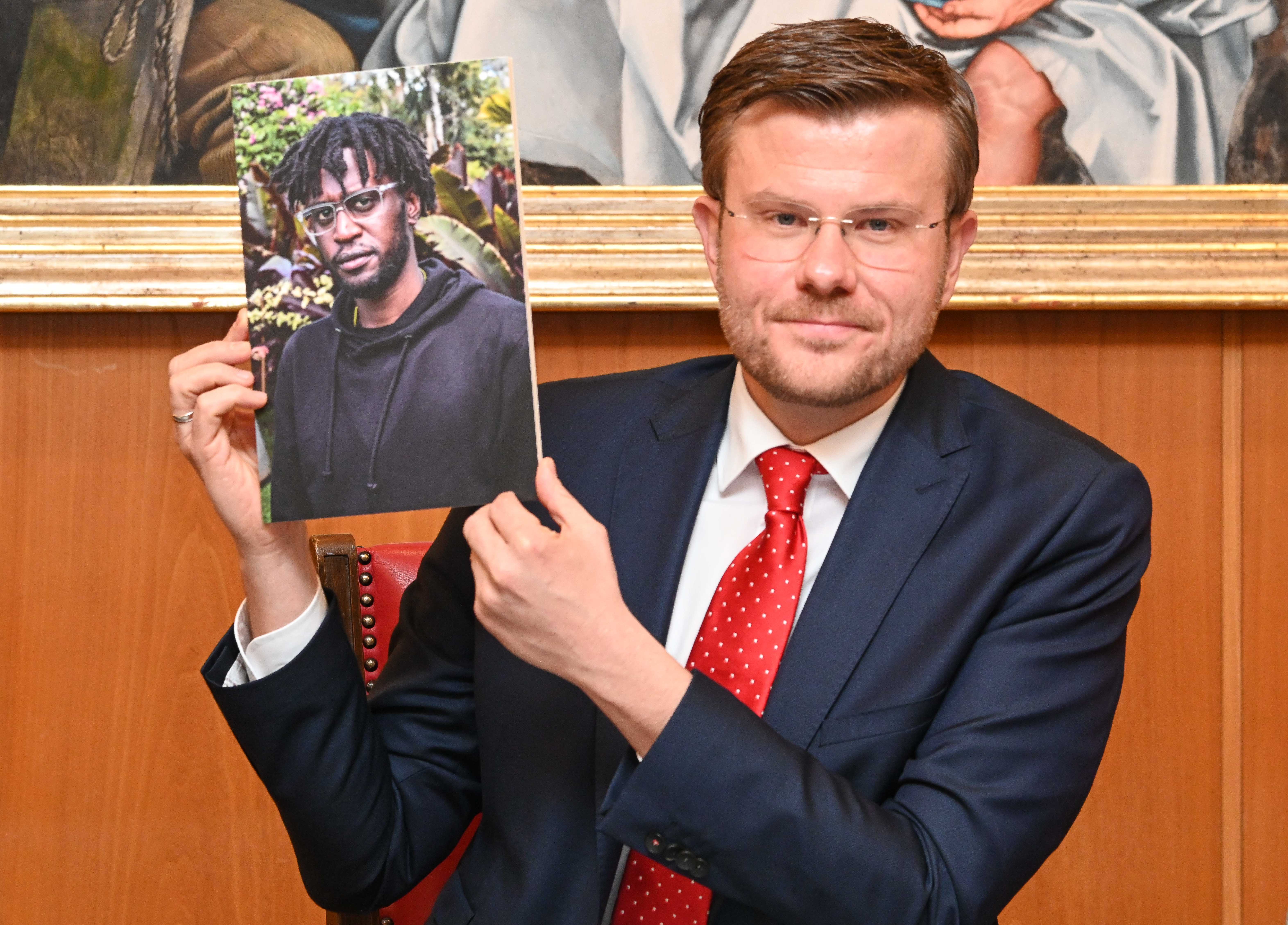 Bekanntgabe des Trägers des Internationalen Nürnberger Menschenrechtspreises 2023 bei der Pressekonferenz im Nürnberger Rathaus: Oberbürgermeister und Jury-Vorsitzender Marcus König mit dem Foto des Preisträgers Malcolm Bidali aus Kenia. Die 15. Preisverleihung findet am Sonntag, 24. September 2023, traditionell im Nürnberger Opernhaus statt.