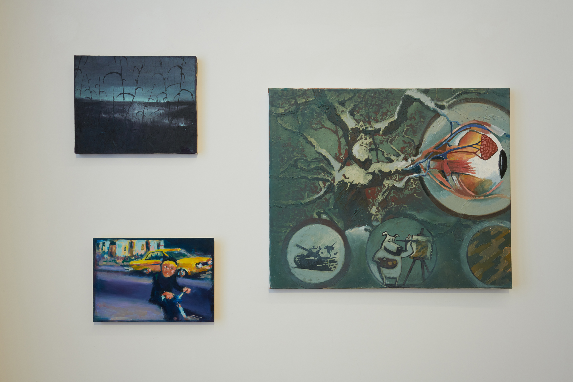 Blick in die Dauerausstellung mit Werken von Jan Gemeinhardt, Morgenstunde, 2016; Martin Fürbringer, Auf dem Rad, 2001 und Roger Libesch, Camouflage, 2015 © Kunstvilla/ Stadt Nürnberg, Foto: Annette Kradisch