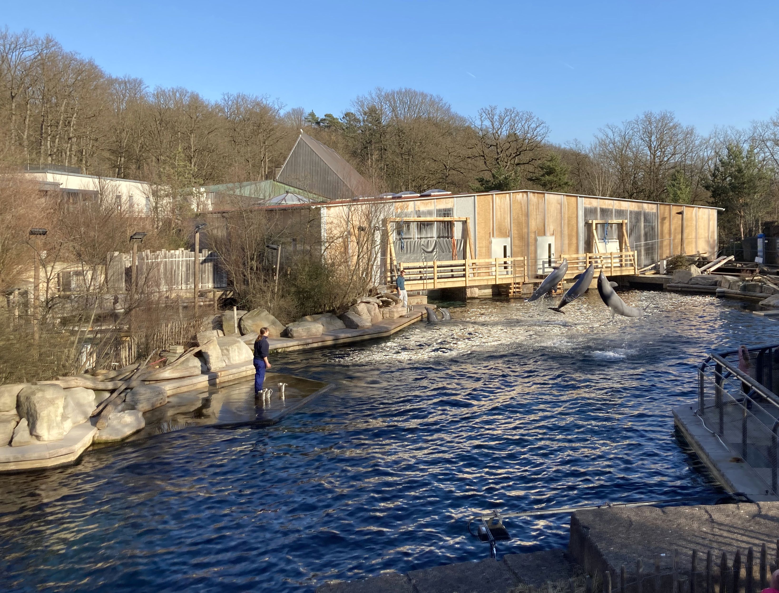 Während die Kalifornischen Seelöwen auch den Winter über im Freien geblieben sind, waren die Delfine in den letzten Monaten ausschließlich im Delfinarium zu sehen. Auch dort fanden mehrmals täglich Präsentationen statt. Hintergrund sind die aktuell laufenden Bauarbeiten an der Delfinlagune: Von Ende Oktober bis Ende Dezember 2022 wurde eine Bauschutzhalle aus Holz über zwei Becken der Lagune errichtet. Die Halle ersetzt die Traglufthalle, die die Großen Tümmler in den vergangenen Wintern vor frostigen Temperaturen schützte. Zugleich dient sie zur Vorbereitung auf ein Pilotprojekt, das die schrittweise Sanierung der Beckenränder und die Ausbesserung der Beckenwände umfasst.